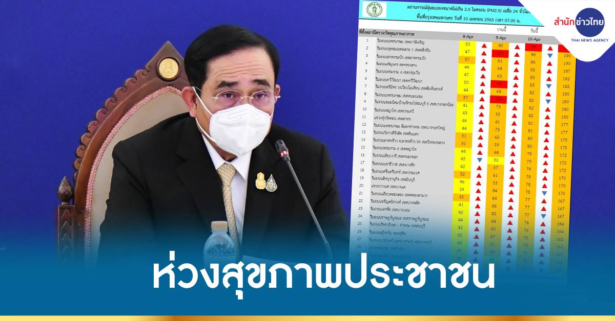 กทม. 10 เม.ย.-นายกฯ ห่วงสุขภาพประชาชนโดยเฉพาะกลุ่มเปราะบาง เหตุช่วงนี้ PM 2.5 สูงกว่ามาตรฐาน แนะสวมหน้ากากอนามัย งดกิจกรรมกลางแจ้ง ติดตามการแจ้งเตือนจากภาครัฐ คาดช่วงสงกรานต์ ค่าฝุ่นดีขึ้น