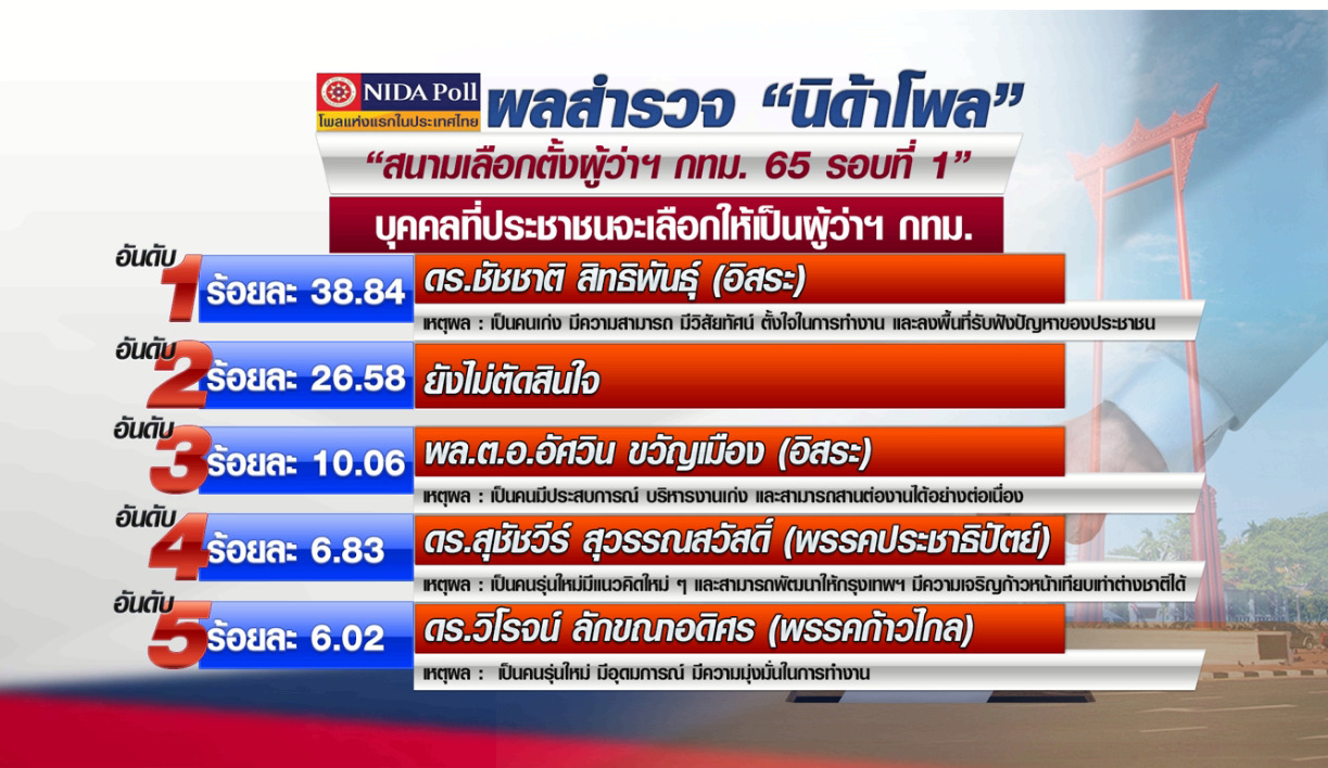 อันดับ 1 ร้อยละ 38.84 คือ ดร.ชัชชาติ สิทธิพันธุ์ ให้เหตุผลที่เลือกคือ เป็นคนเก่ง มีความสามารถ มีวิสัยทัศน์ ตั้งใจในการทำงาน และลงพื้นที่รับฟังปัญหาของประชาชน