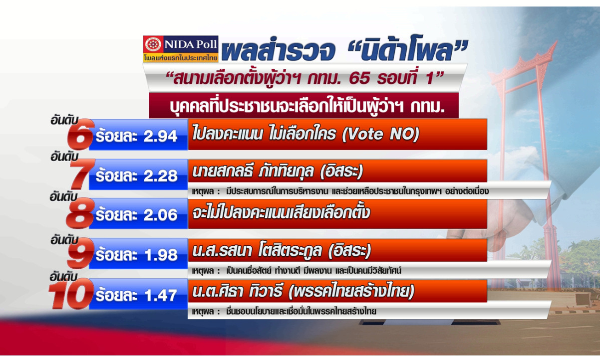 กรุงเทพฯ 10 เม.ย.- ผลสำรวจของนิด้าโพลเกี่ยวกับบุคคลที่ประชาชน อยากเลือกให้มาเป็นผู้ว่าฯ กทม. เรื่อง “สนามเลือกตั้ง ผู้ว่าฯ กทม. 65 รอบที่ 1” มีใครกันบ้าง ไปลองไล่ดูกัน