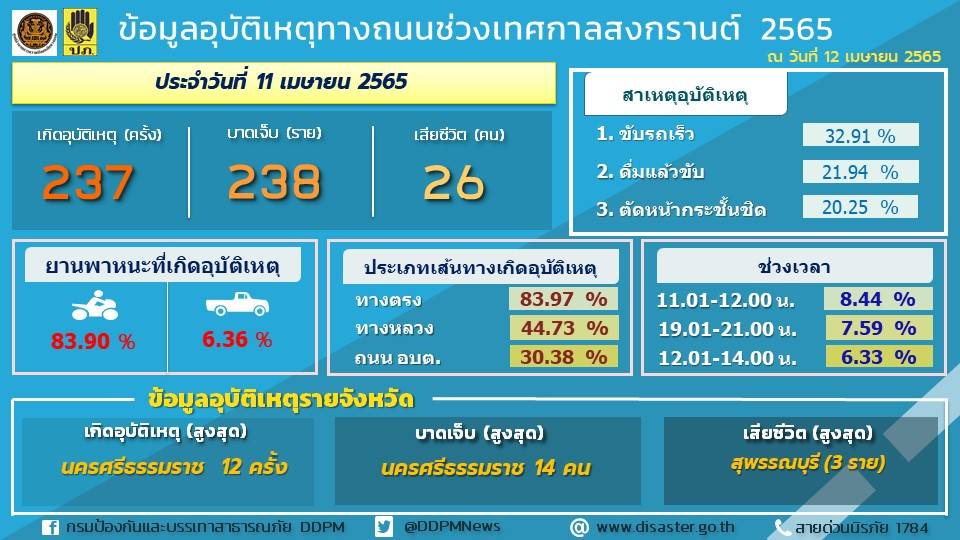 นายนิรัตน์ พงษ์สิทธิถาวร รองปลัดกระทรวงมหาดไทย หัวหน้ากลุ่มภารกิจด้านสาธารณภัยและพัฒนาเมืองในฐานะประธานการประชุมคณะอนุกรรมการเฉพาะกิจศูนย์อำนวยการป้องกันและลดอุบัติเหตุทางถนนตลอดทั้งปี (ผ่านสื่ออิเล็กทรอนิกส์) เปิดเผยว่า ศูนย์อำนวยการป้องกันและลดอุบัติเหตุทางถนนช่วงเทศกาลสงกรานต์ พ.ศ.2565 โดยกรมป้องกันและบรรเทาสาธารณภัย และความร่วมมือของหน่วยงานภาคีเครือข่ายได้รวบรวมสถิติอุบัติเหตุทางถนนประจำวันที่ 11 เมษายน 2565 ซึ่งเป็นวันแรกของการรณรงค์ “ชีวิตวิถีใหม่ ขับขี่อย่างปลอดภัย ไร้อุบัติเหตุ” เกิดอุบัติเหตุ 237 ครั้งผู้เสียชีวิต 26 ราย ผู้บาดเจ็บ 238 คน โดยสาเหตุที่ทำให้เกิดอุบัติเหตุสูงสุด ได้แก่ ขับรถเร็วเกินกำหนด ร้อยละ 32.91 ดื่มแล้วขับ ร้อยละ 21.94 ยานพาหนะที่เกิดอุบัติเหตุสูงสุด ได้แก่ รถจักรยานยนต์ ร้อยละ 83.90 ส่วนใหญ่เกิดบนถนนกรมทางหลวง ร้อยละ 44.73 ถนนใน อบต./หมู่บ้าน ร้อยละ 30.38 บริเวณจุดเกิดเหตุเป็นทางตรง ร้อยละ 83.97 ช่วงเวลาที่เกิดอุบัติเหตุสูงสุด ได้แก่ ช่วงเวลา 11.01 – 12.00 น. ร้อยละ 8.44 ผู้บาดเจ็บและเสียชีวิตอยู่ในช่วงอายุ 20 – 29 ปี ร้อยละ 23.86