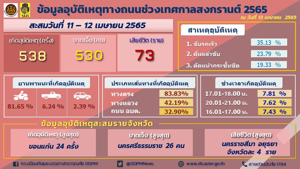 สรุปสถิติอุบัติเหตุทางถนนสะสม 2 วัน (วันที่ 11-12 เมษายน 2565) เกิดอุบัติเหตุรวม 538 ครั้ง ผู้เสียชีวิต 73 ราย ผู้บาดเจ็บ 530 คน โดยสาเหตุหลักยังคงเกิดจากการขับรถเร็วและการดื่มแล้วขับ ทั้งนี้ พฤติกรรมเสี่ยง ที่ทำให้บาดเจ็บและเสียชีวิตสูงสุด คือ ไม่สวมหมวกนิรภัย จังหวัดที่เกิดอุบัติเหตุสะสมสูงสุด ได้แก่ ขอนแก่น (24 ครั้ง) จังหวัดที่มีผู้เสียชีวิตสะสมสูงสุด ได้แก่ นครราชสีมา และพระนครศรีอยุธยา (จังหวัดละ 4 ราย) จังหวัดที่มีผู้บาดเจ็บสะสมสูงสุด ได้แก่ นครศรีธรรมราช (26 คน) จังหวัดที่ไม่มีผู้เสียชีวิตรวม 34 จังหวัด