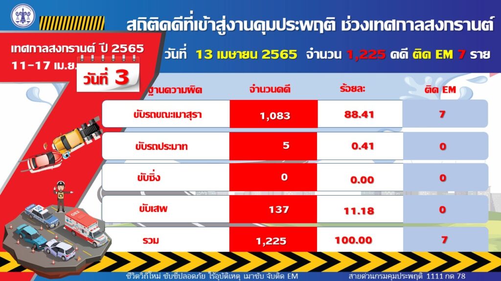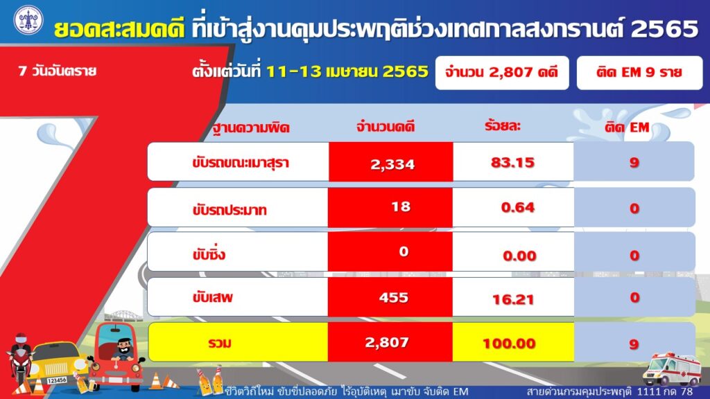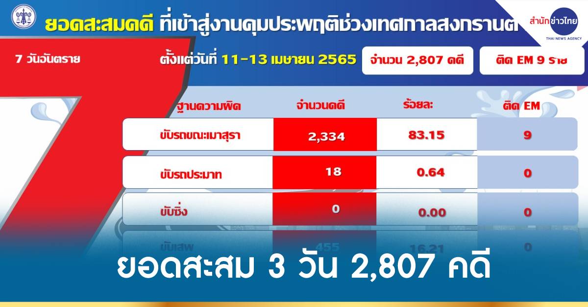สำหรับยอดสะสม 3 วันของ 7 วันอันตราย (11-13 เมษายน 2565) 2,807 คดี จำแนกเป็น