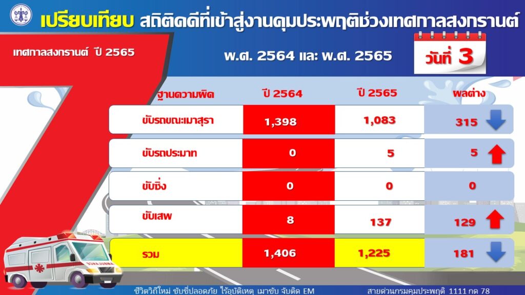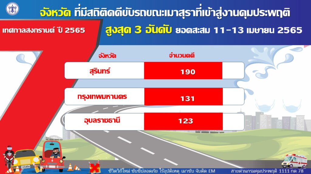 วันนี้ (14 เมษายน 2565) นายวิตถวัลย์ สุนทรขจิต อธิบดีกรมคุมประพฤติ กล่าวถึง สถิติคดีที่ศาลสั่งคุมความประพฤติวันที่ 3 ของ 7 วันอันตราย (13 เมษายน 2565) มีคดีทั้งสิ้น 1,225 คดี เป็นคดีขับรถขณะเมาสุรา 1,083 คดี ศาลสั่งติด EM 7 ราย คดีขับรถประมาท 5 คดี คดีขับเสพ 137 คดี สุรินทร์ยังคงครองคดีเมาขับอันดับหนึ่ง 190 คดี รองลงมา กรุงเทพมหานคร 131 คดี และ อุบลราชธานี 123 คดี เมื่อเปรียบเทียบสถิติคดีในวันที่ 3 ของ 7 วันอันตรายปี 2564 พบว่า คดีขับรถขณะเมาสุรา จำนวน 1,398 คดี และปี 2565 จำนวน 1,083 คดี ลดลง จำนวน 315 คดี คิดเป็นร้อยละ 22.53