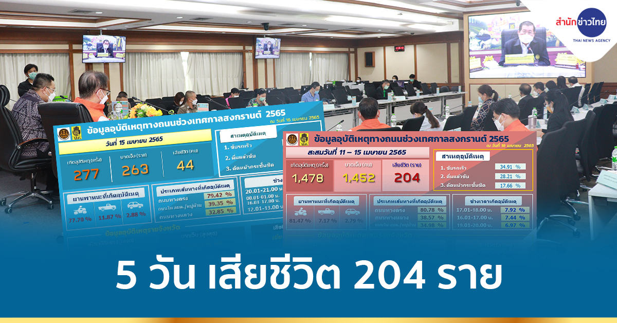 ศูนย์อำนวยการป้องกันและลดอุบัติเหตุทางถนนช่วงเทศกาลสงกรานต์ พ.ศ.2565 สรุปสถิติอุบัติเหตุทางถนนประจำวันที่ 15 เมษายน 2565 เกิดอุบัติเหตุ 277 ครั้ง ผู้บาดเจ็บ 263 คน ผู้เสียชีวิต 44 ราย สถิติอุบัติเหตุสะสม 5 วัน (11 – 15 เมษายน 2565) เกิดอุบัติเหตุรวม 1,478 ครั้ง ผู้บาดเจ็บ 1,452 คน ผู้เสียชีวิต 204 ราย เน้นดูแลความปลอดภัยและอำนวยความสะดวกแก่ประชาชนในการเดินทางควบคู่กับมาตรการป้องกันโรคโควิด – 19 อย่างเข้มข้น จัดเจ้าหน้าที่ประจำจุดตรวจบังคับใช้กฎหมายอย่างต่อเนื่องในเส้นทางสายต่าง ๆ โดยเฉพาะเส้นทางสายหลัก สายรอง ทางเลี่ยง ทางลัด ถนนทางตรง วิ่งสวนเลน และไม่มีเกาะกลาง พร้อมคุมเข้มผู้ขับขี่ที่มีพฤติกรรมเสี่ยง ทั้งขับรถเร็ว ดื่มแล้วขับ ไม่ใช้อุปกรณ์นิรภัย รวมถึงประเมินความพร้อมของผู้ขับขี่เพื่อป้องกันอุบัติเหตุจากการขับรถเร็วและง่วงหลับใน อีกทั้งขอให้ผู้ขับขี่เพิ่มความระมัดระวังเป็นพิเศษในเส้นทางที่มีฝนตกและลมกระโชกแรง เพื่อให้การเดินทางเป็นไปด้วยความปลอดภัย