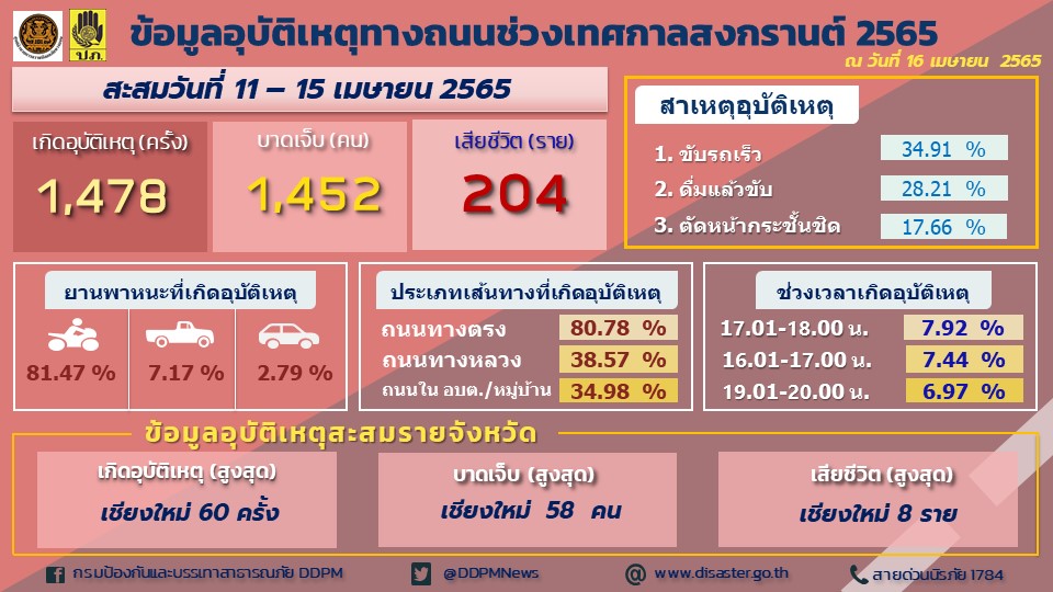 สรุปสถิติอุบัติเหตุทางถนนสะสม 5 วัน (วันที่ 11 – 15 เมษายน 2565) เกิดอุบัติเหตุรวม 1,478 ครั้ง ผู้บาดเจ็บ 1,452 คน ผู้เสียชีวิต 204 ราย จังหวัดที่เกิดอุบัติเหตุสะสมสูงสุด ได้แก่ เชียงใหม่ (60 ครั้ง) จังหวัดที่มีผู้บาดเจ็บสะสมสูงสุด ได้แก่ เชียงใหม่ (58 คน) จังหวัดที่มีผู้เสียชีวิตสะสมสูงสุด ได้แก่ เชียงใหม่ (8 ราย) จังหวัดที่ไม่มีผู้เสียชีวิตรวม 12 จังหวัด ได้แก่ ตรัง นครพนม บึงกาฬ ปราจีนบุรี ปัตตานี ยะลา ระนอง ลำพูน สมุทรสงคราม สิงห์บุรี หนองบัวลำภู และอำนาจเจริญ