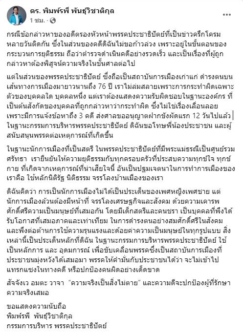 ดร.พิมพ์รพี พันธุ์วิชาติกุล กรรมการบริหารพรรคประชาธิปัตย์ โพสต์ Facebook เรื่อง ขอโทษต่อข่าวฉาวของอดีตรองหัวหน้าพรรคประชาธิปัตย์ มีเนื้อหาระบุว่า กรณีข้อกล่าวหาของอดีตรองหัวหน้าพรรคประชาธิปัตย์ที่เป็นข่าวครึกโครมหลายวันติดกัน ซึ่งในส่วนของคดี ดิฉันไม่ขอก้าวล่วง เพราะอยู่ในขั้นตอนของกระบวนการยุติธรรม ถือว่าตำรวจดำเนินคดีอย่างรวดเร็ว และเป็นเรื่องที่ผู้ถูกกล่าวหาต้องพิสูจน์ความจริงในชั้นศาลต่อไป แต่ในส่วนของพรรคประชาธิปัตย์ ซึ่งถือเป็นสถาบันการเมืองเก่าแก่ ดำรงตนบนเส้นทางการเมืองมายาวนานถึง 76 ปี เราไม่ล่มสลายเพราะการกระทำผิดเฉพาะตัวของบุคคลใด บุคคลหนึ่ง แต่เราต้องแสดงความรับผิดชอบในฐานะองค์กรที่เป็นต้นสังกัดของบุคคลที่ถูกกล่าวหาว่ากระทำผิด ซึ่งไม่ใช่เรื่องเลื่อนลอย เพราะมีการแจ้งข้อหาถึง 3 คดี ส่งศาลขออนุญาตฝากขังผัดแรก 12 วันไปแล้ว ในฐานะกรรมการบริหารพรรคประชาธิปัตย์ ดิฉันขอโทษพี่น้องประชาชน และผู้สนับสนุนพรรคต่อเหตุการณ์ที่เกิดขึ้น