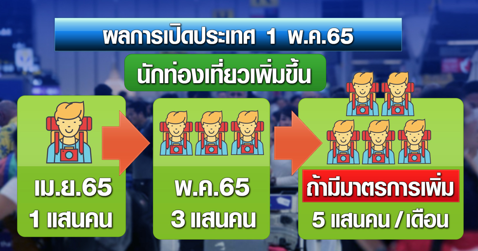 นายธนวรรธน์ พลวิชัย อธิการบดีมหาวิทยาลัยหอการค้าไทย บอกว่า ปัจจัยที่ไทยเริ่มเปิดประเทศเต็มรูปแบบในวันนี้ จะช่วยให้ไทยมีนักท่องเที่ยวเพิ่มเป็น 3 แสนคนต่อเดือน หลังจากชะลอตัวเหลือกว่า 1 แสนคนต่อเดือนในช่วงเดือนมีนาคมถึงเมษายน จากการระบาดของโควิด-19 สายพันธุ์โอไมครอน และปัจจัยอื่น ๆ