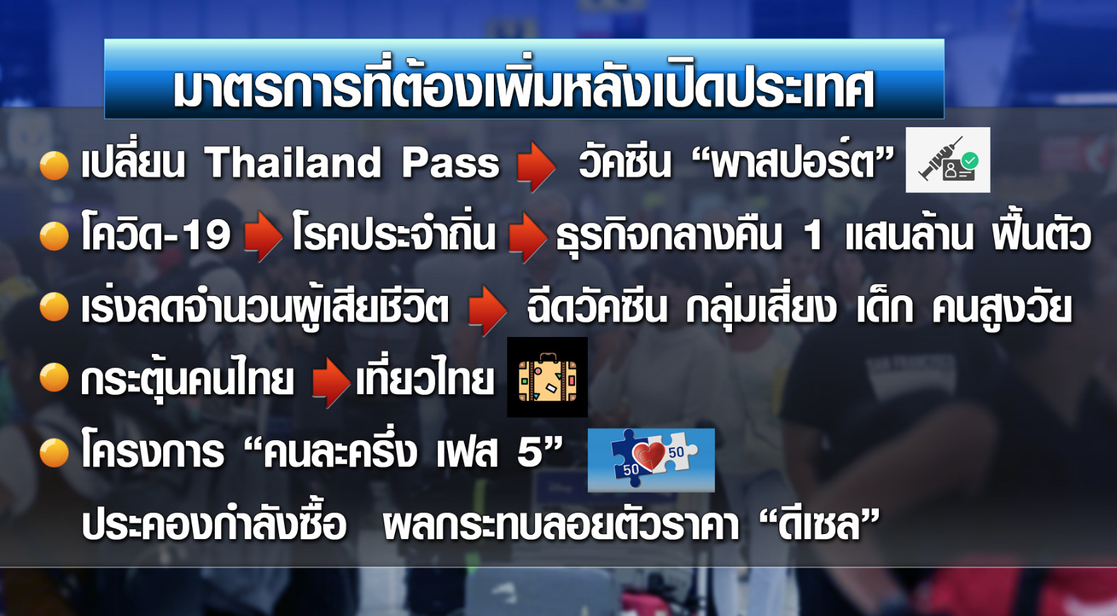 โดยเห็นว่าหากไทยมีมาตรการเพิ่มเติม หลังเปิดประเทศจะเพิ่มนักท่องเที่ยวได้อีกเป็น 5-6 แสนคนต่อเดือน เช่น การเปลี่ยนมาตรการไทยแลนด์พาส ที่ทำให้นักท่องเที่ยวไม่สะดวกเป็นวัคซีนพาสปอร์ต การเร่งดำเนินการให้โควิดเป็นโรคประจำถิ่น เพื่อฟื้นธุรกิจกลางคืนมูลค่า 50,000 – 100,000 ล้านบาท ซึ่งซบเซากว่า 2 ปี กลับมา การเร่งฉีดวัคซีนให้กลุ่มเสี่ยง เพื่อลดยอดผู้เสียชีวิตจากโควิด และที่สำคัญภาครัฐยังต้องมีมาตรการส่งเสริมไทยเที่ยวไทย รวมทั้งหอการค้าไทย เห็นว่าภาครัฐยังต้องทำมาตรการคนละครึ่งเฟส 5 เพื่อช่วยประคองกำลังซื้อที่ได้รับผลกระทบจากการลอยตัวน้ำมันดีเซล