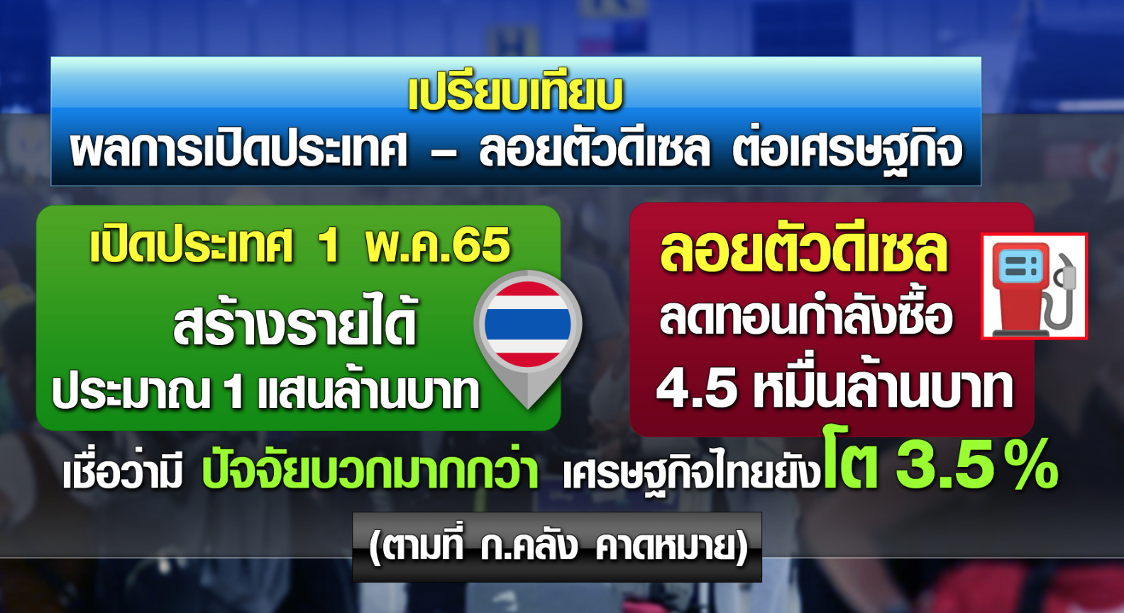 กรุงเทพฯ 1 พ.ค.- รมว.คลัง เชื่อเปิดประเทศฟื้นท่องเที่ยว หนุนเศรษฐกิจไทยโต 3.5% ธุรกิจการบินหนุนรัฐออกแคมเปญเสริมท่องเที่ยว คาดสร้างรายได้แสนล้านบาท