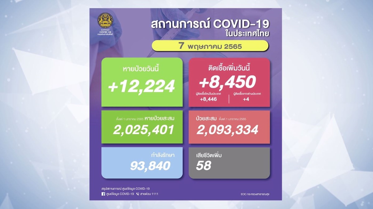 ศูนย์ข้อมูล COVID-19 รายงานสถานการณ์โควิด-19 วันนี้ (7 พ.ค.65) พบผู้ติดเชื้อรายใหม่ 8,450 ราย ทำให้ยอดผู้ป่วยสะสม ตั้งแต่วันที่ 1 มกราคม 2565 ทั้งสิ้น 2,093,334 ราย หายป่วยกลับบ้าน 12,224 ราย รวมหายป่วยสะสม 2,025,401 ราย และยังมีผู้ป่วยกำลังรักษา 93,840 ราย เสียชีวิตเพิ่ม 58 ราย