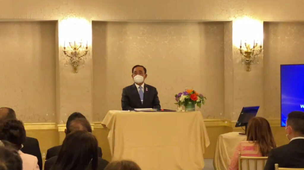 นายกรัฐมนตรี กล่าวว่า ในวันนี้จะเจอกับผู้นำสหรัฐฯ และผู้นำอาเซียน และสิ่งสำคัญที่เชิญรองนายกรัฐมนตรีด้านเศรษฐกิจมาด้วย เพราะจะมีการพูดคุยกับภาคธุรกิจที่สำคัญของสหรัฐฯ เชิญชวนให้ลงทุนในประเทศไทย ขณะที่ความร่วมมือในการฟื้นฟูเศรษฐกิจ หลังสถานการณ์โควิด-19 เริ่มคลี่คลาย เพราะยอดผู้ติดเชื้อของไทยเริ่มลดลงต่ำกว่าหมื่นติดต่อกันหลายวัน และไทยรณรงค์ให้ฉีดวัคซีนอย่างทั่วถึง เพื่อป้องกันการป่วยหนักและเสียชีวิต ซึ่งหลายคนกลัว แต่ตนเองฉีดมา 4 เข็มแล้ว โดยช่วงหนึ่งของการพูดคุย นายกฯ ได้สอบถามคนไทยในสหรัฐฯ ว่า กลัวติดเชื้อโควิด-19 กันหรือไม่ พร้อมระบุว่า เราต้องอยู่กับมันให้ได้ ซึ่งไทยได้รับคำชื่นชมที่ไทยบริหารจัดการได้ในระดับต้นของโลก บางอย่างเป็นอันดับหนึ่งของโลก ที่ผ่านมาต้องกำกับดูแลอย่างเข้มงวด เพื่อความปลอดภัย ยอดผู้ติดเชื้อถึงลดลง อาจจะลำบาก แต่จะค่อยๆ ดีขึ้น ซึ่งวันนี้ได้รับความร่วมมือจากทุกฝ่ายมากขึ้น ไทยเริ่มเปิดประเทศแล้ว หลายประเทศใช้ไทยเป็นต้นแบบ และตอนนี้ได้เริ่มเปิดให้เดินทางผ่านชายแดนแล้ว และข่าวดีคือการท่องเที่ยวของไทย ตัวเลขนักท่องเที่ยวเพิ่มขึ้นต่อวันหลายหมื่นคน คาดว่าในช่วงปลายปีนี้อาจจะขึ้นไปถึง 2-5 ล้านคน หากไม่มีปัญหาใดเกิดขึ้นอีก อาจจะอยู่ที่ 5-10 ล้านคน
