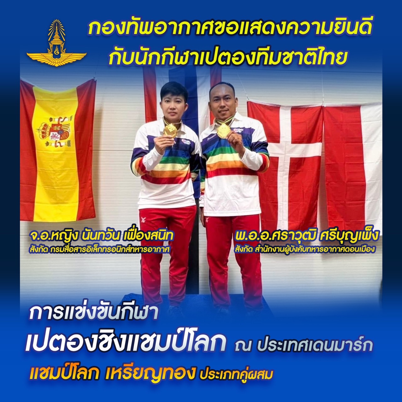 พล.อ.ต.บุญเลิศ อันดารา โฆษกกองทัพอากาศ เปิดเผยว่า เมื่อวันที่ 12 – 15 พฤษภาคม 2565 ที่ผ่านมา นักกีฬาเปตองสังกัดกองทัพอากาศ ได้สร้างชื่อเสียงให้แก่ประเทศไทย และสร้างความภาคภูมิใจให้กองทัพอากาศอีกครั้งในการแข่งขันกีฬาเปตองชิงแชมป์โลก 2022 ณ ประเทศเดนมาร์ก ซึ่งมีนักกีฬาเปตองสังกัดกองทัพอากาศ เป็นตัวแทนประเทศไทยเข้าร่วมการแข่งขัน และได้รับเหรียญรางวัล จำนวน 3 คน คือรางวัลชนะเลิศ ประเภทคู่ผสม (เหรียญทอง) ได้แก่ พันจ่าอากาศเอก ศราวุฒิ ศรีบุญเพ็ง สังกัดสำนักงานผู้บังคับทหารอากาศดอนเมือง และจ่าอากาศเอกหญิง นันทวัน เฟื่องสนิท สังกัดกรมสื่อสารอิเล็กทรอนิกส์ทหารอากาศ ซึ่งเป็นการป้องกันแชมป์โลกไว้ได้เป็นสมัยที่ 2 ของทั้งคู่ 2 รางวัลรองชนะเลิศอันดับ 2 ประเภทหญิงเดี่ยว (เหรียญทองแดง) ได้แก่ เรืออากาศโทหญิง พันธ์ทิพา วงศ์ชูเวช สังกัดโรงเรียนการบิน โดยนางศิริลักษณ์ นิยม เอกอัครราชทูต ณ กรุงโคเปนเฮเกน ประเทศเดนมาร์กเดินทางไปให้กำลังใจพร้อมมอบรางวัลให้แก่นักกีฬาทีมชาติไทยที่เข้าร่วมการแข่งขัน