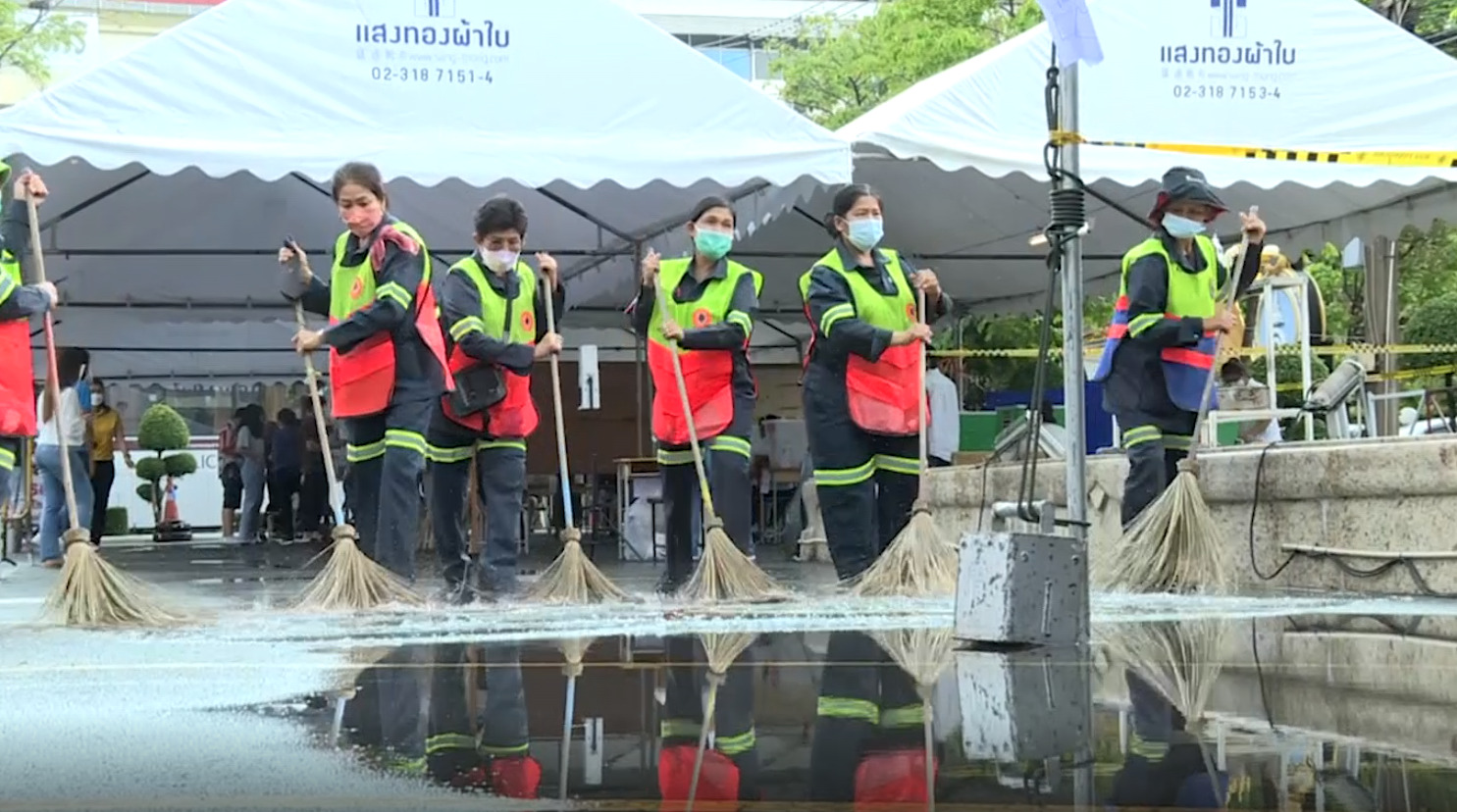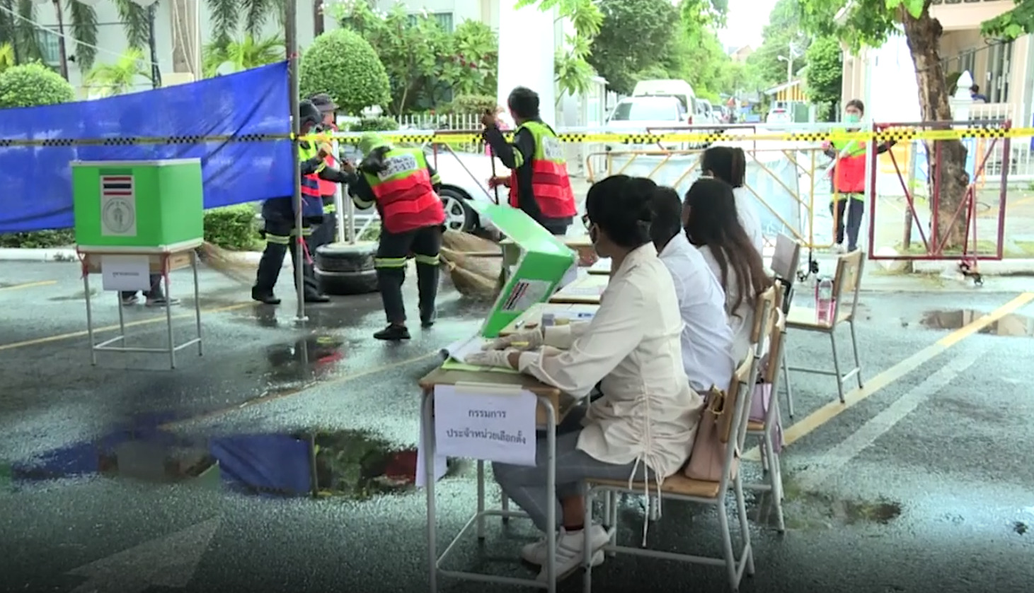 หลังฝนหยุดตก เจ้าหน้าที่ กทม. ตั้งแถวหน้ากระดานใช้ไม้กวาดกวาดไล่น้ำที่ขังอยู่ตามพื้นกันอย่างขยันขันแข็ง เพื่ออำนวยความสะดวกให้กับประชาชนที่มาใช้สิทธิ์