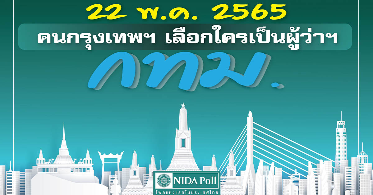 ศูนย์สำรวจความคิดเห็น “นิด้าโพล” สำรวจความคิดเห็น เรื่อง “22 พ.ค. 2565 คนกรุงเทพฯ เลือกใครเป็นผู้ว่าฯ กทม.” ระหว่างวันที่ 18-21 พ.ค.2565 (ก่อนวันเลือกตั้ง) จากประชาชนที่มีอายุ 18 ปีขึ้นไป และมีสิทธิเลือกตั้งในเขตกรุงเทพมหานคร ครอบคลุมพื้นที่ทั้ง 50 เขต กระจายทุกระดับการศึกษา อาชีพ และรายได้ จำนวน 2,500 หน่วยตัวอย่าง กำหนดค่าความเชื่อมั่นที่ร้อยละ 97.0