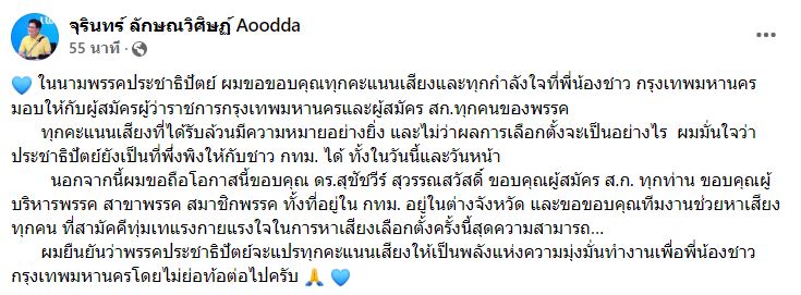 “ในนามพรรคประชาธิปัตย์ ผมขอขอบคุณทุกคะแนนเสียงและทุกกำลังใจที่พี่น้องชาวกรุงเทพมหานคร มอบให้กับผู้สมัครผู้ว่าราชการกรุงเทพมหานครและผู้สมัคร ส.ก.ทุกคนของพรรค ทุกคะแนนเสียงที่ได้รับล้วนมีความหมายอย่างยิ่ง และไม่ว่าผลการเลือกตั้งจะเป็นอย่างไร ผมมั่นใจว่าประชาธิปัตย์ยังเป็นที่พึ่งพิงให้กับชาว กทม. ได้ ทั้งในวันนี้และวันหน้า