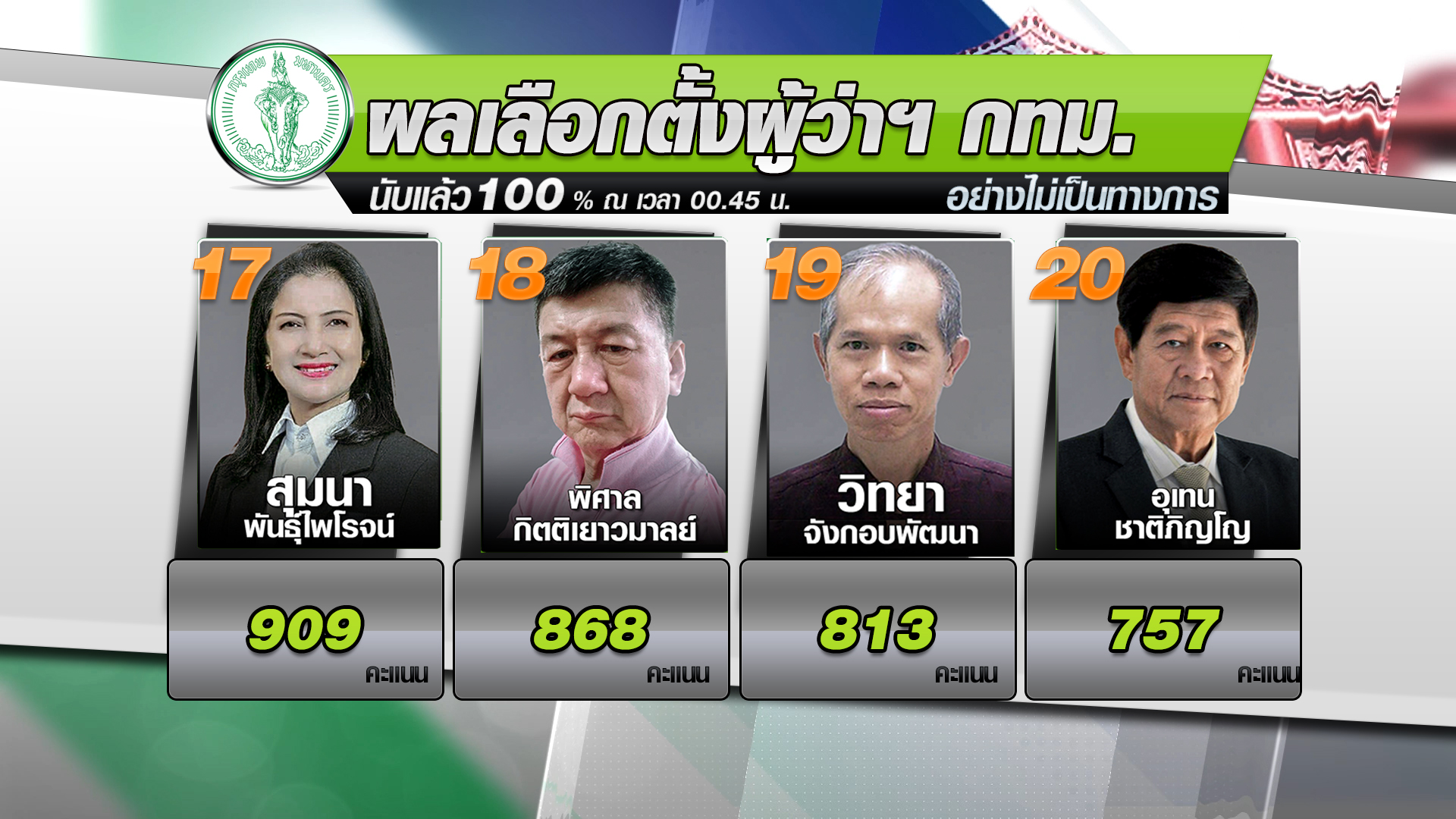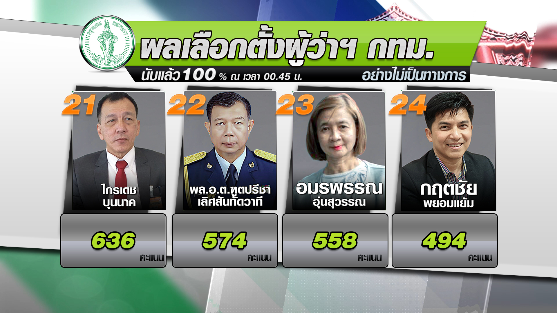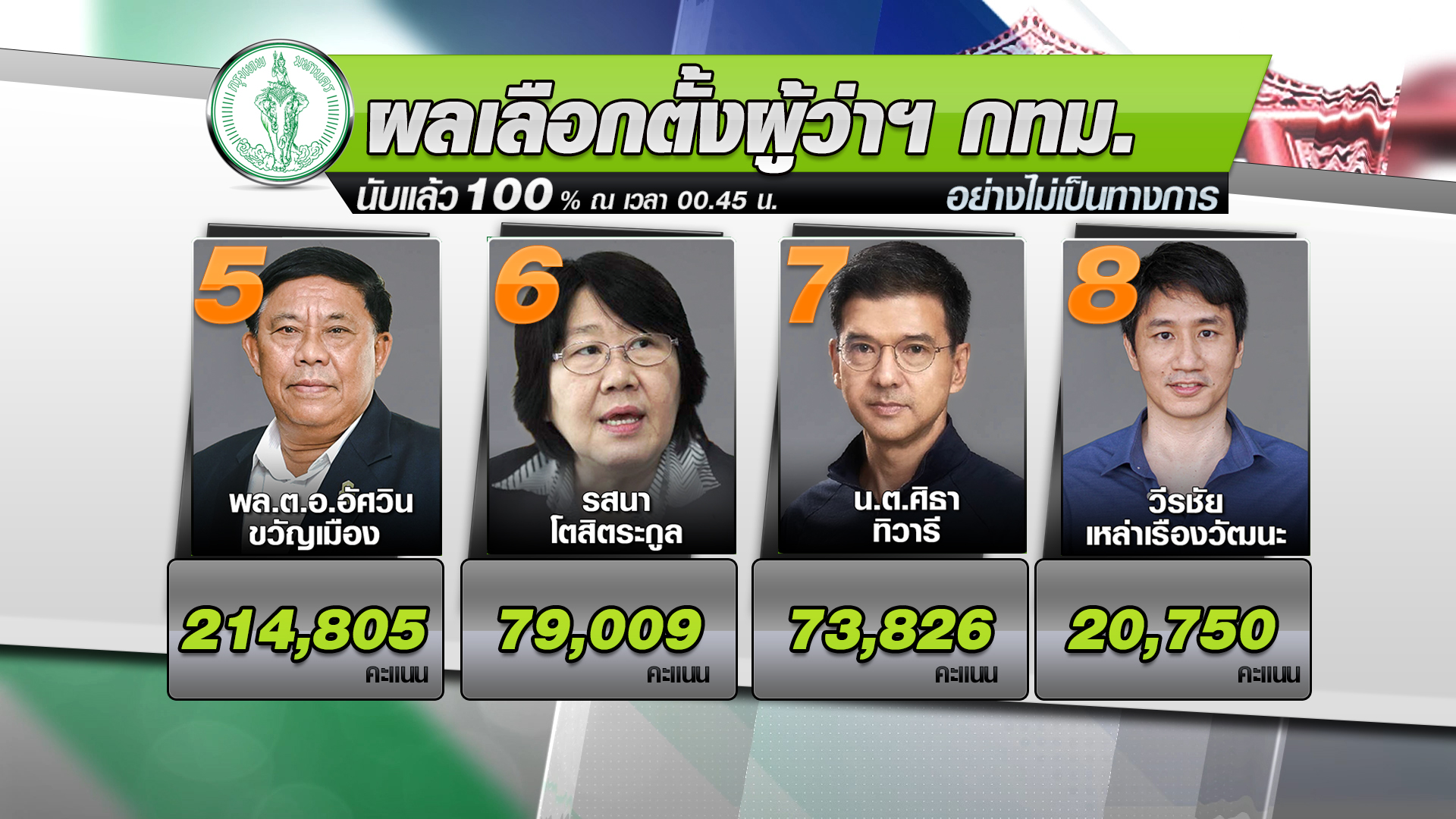 ผลการเลือกตั้งผู้ว่าราชการกรุงเทพมหานคร อย่างไม่เป็นทางการ หลังนับคะแนนครบ 100% ณ เวลา 00.45 น. วันที่ 23 พฤษภาคม 2565