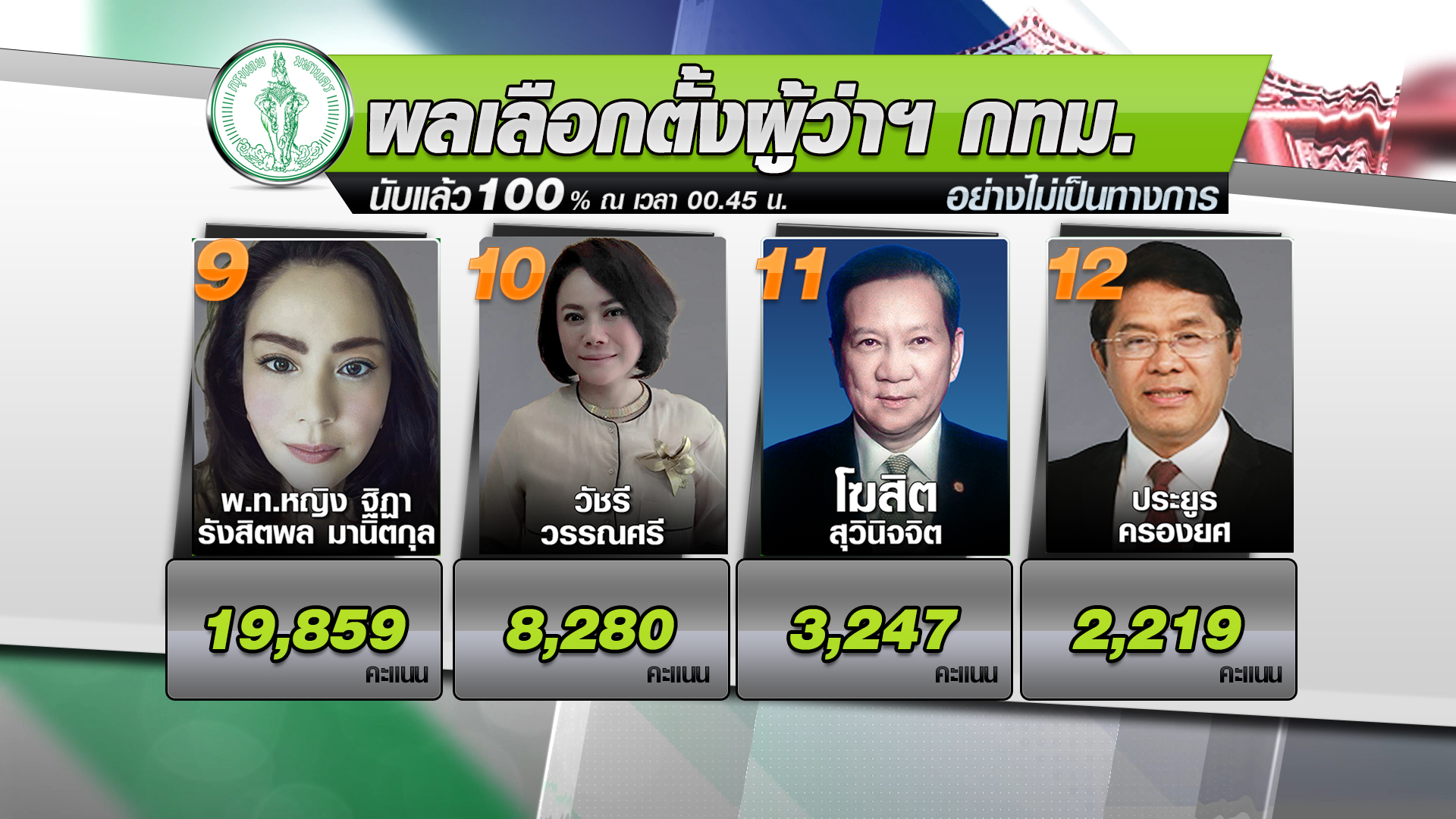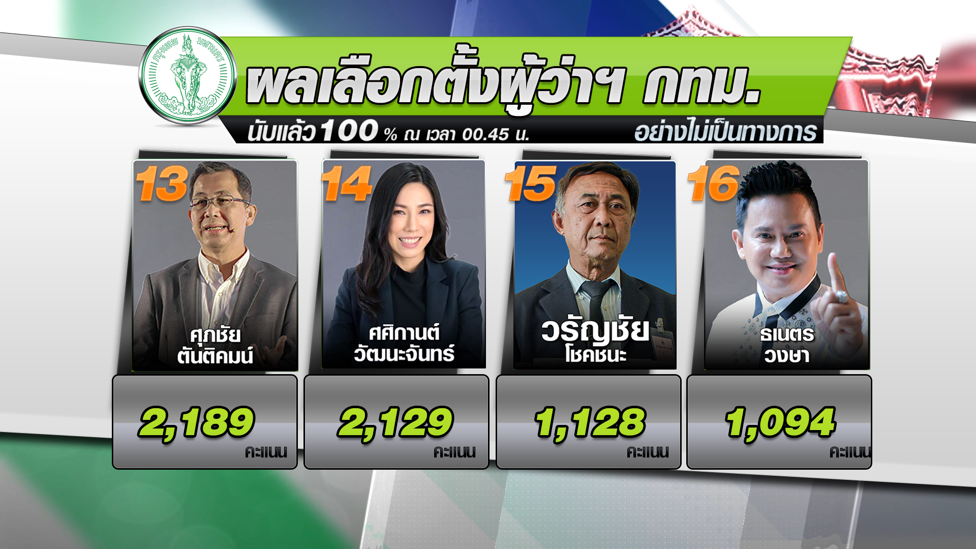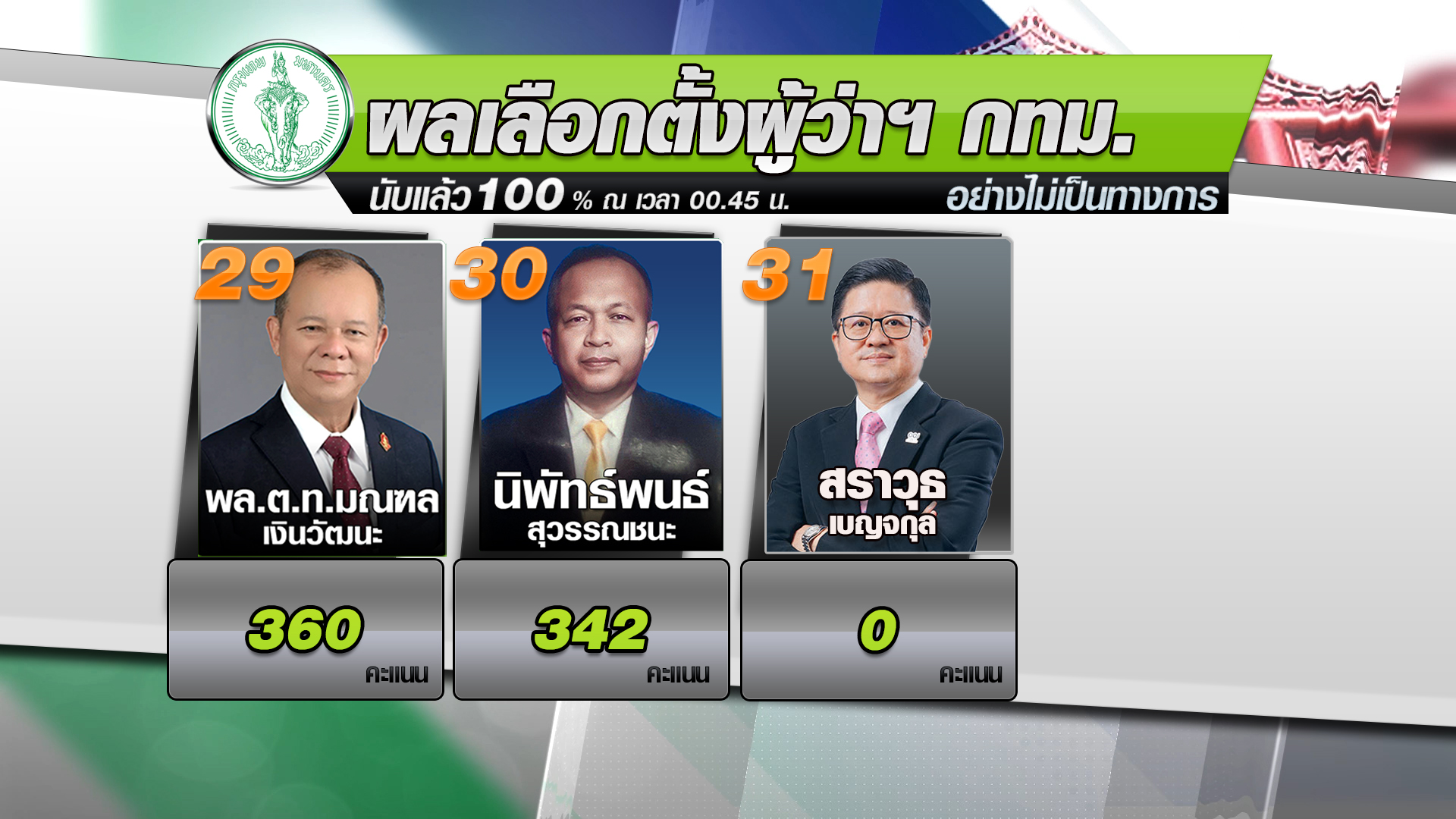 ผลการเลือกตั้งผู้ว่าราชการกรุงเทพมหานคร อย่างไม่เป็นทางการ หลังนับคะแนนครบ 100% ณ เวลา 00.45 น. วันที่ 23 พฤษภาคม 2565
