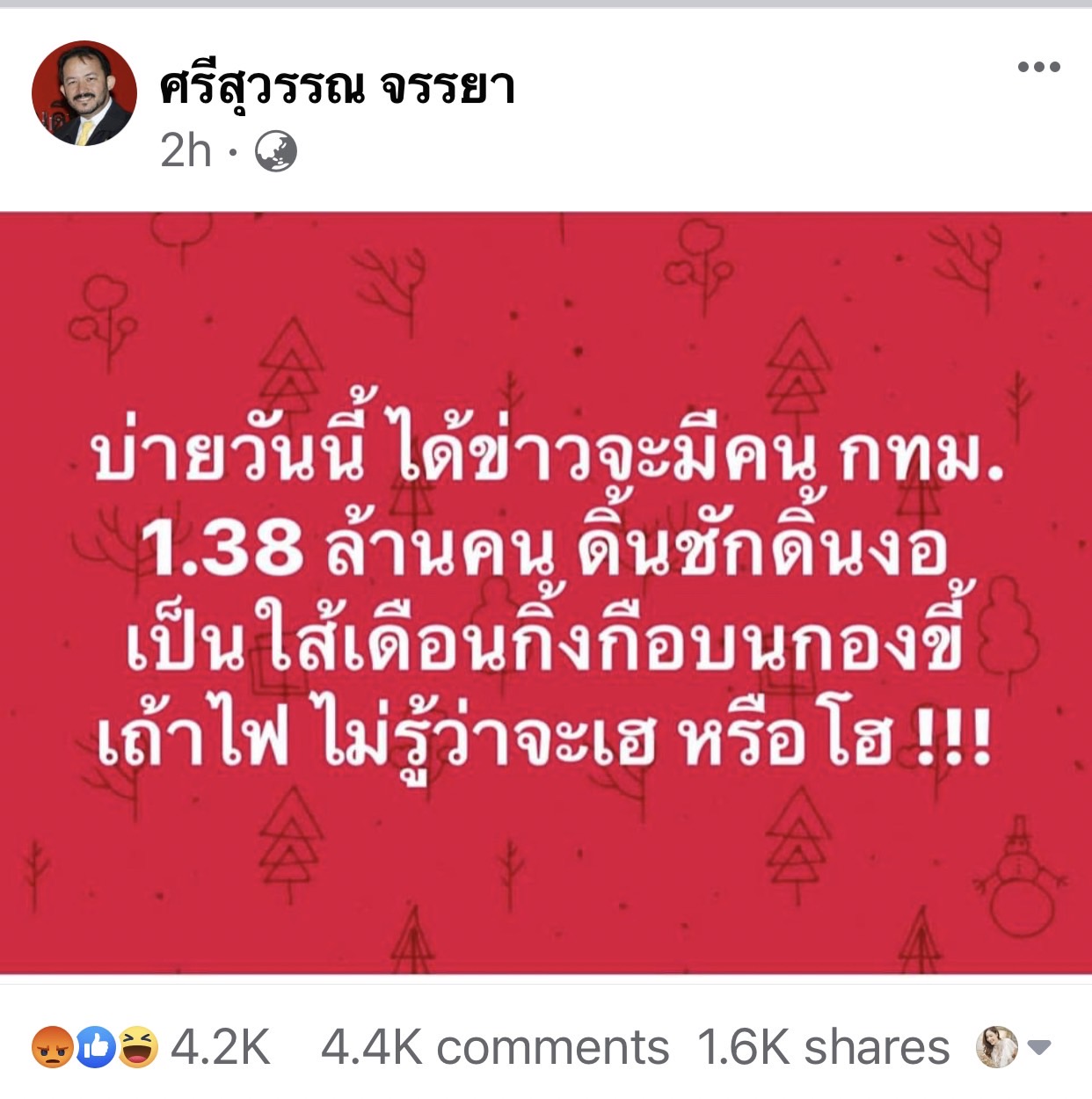 ผู้สื่อข่าวรายงานว่า นายศรีสุวรรณ จรรยา เลขาธิการสมาคมองค์การพิทักษ์รัฐธรรมนูญไทย โพสต์เฟซบุ๊ก “ศรีสุวรรณ จรรยา” ระบุว่า “บ่ายวันนี้ ได้ข่าวจะมีคนกทม. 1.38 ล้านคน ดิ้นชักดิ้นงอเป็นไส้เดือนกิ้งกือบนกองขี้เถ้าไฟ ไม่รู้ว่าจะเฮ หรือ โฮ!!!.”