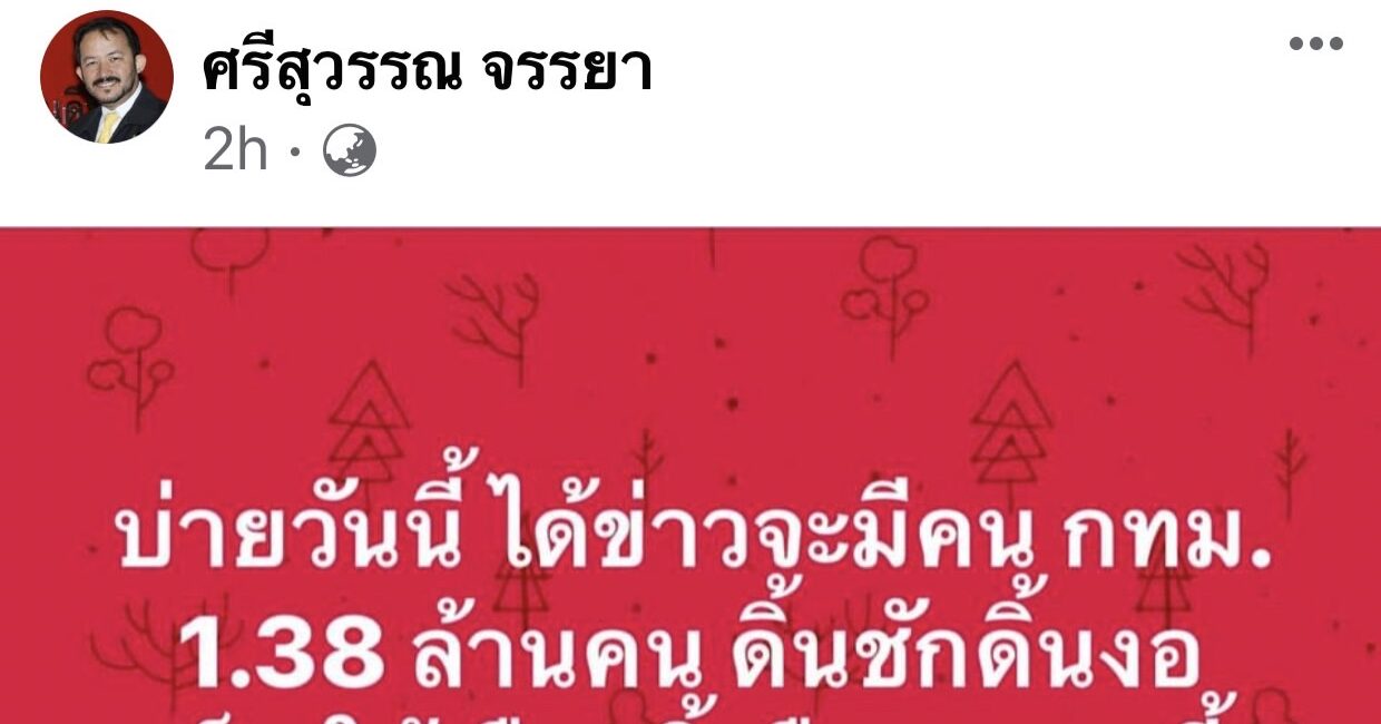 กรุงเทพฯ 31 พ.ค.-“ศรีสุวรรณ” โพสต์เย้ยบ่ายนี้คนกรุงเทพฯ 1.38 ล้านคน ดิ้นชักดิ้นงอเป็นไส้เดือนกิ้งกือบนกองขี้เถ้าไฟ ก่อนเจอทัวร์ถล่มยับ