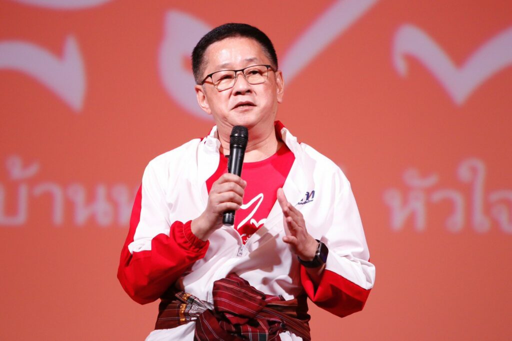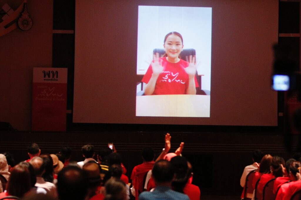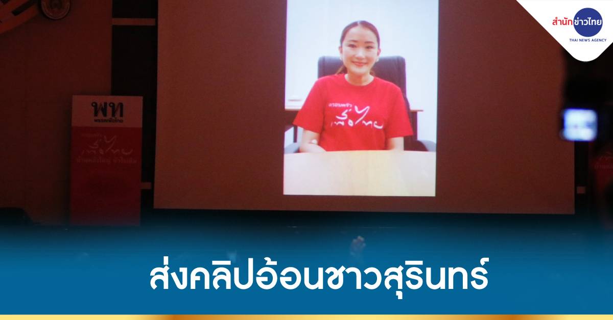 จากนั้น นางสาวแพทองธาร ชินวัตร หัวหน้าครอบครัวเพื่อไทย และประธานคณะที่ปรึกษาด้านการมีส่วนร่วมและนวัตกรรม พรรคเพื่อไทย ได้ส่งคลิปวิดีโอมาพูดคุยกับชาวสุรินทร์ บนเวที ‘ครอบครัวเพื่อไทย บ้านหลังใหญ่หัวใจเดิม ไปเยี่ยมยามถามข่าวชาวสุรินทร์’