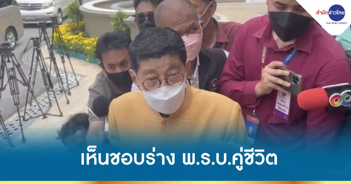 นายวิษณุ เครืองาม รองนายกรัฐมนตรี เปิดเผยว่า ที่ประชุมคณะรัฐมนตรีให้ความเห็นชอบร่างพระราชบัญญัติคู่ชีวิต ตามที่กระทรวงยุติธรรมเสนอ ซึ่งได้นำความเห็นจากสถาบันการศึกษา หน่วยงานที่เกี่ยวข้อง และ ผู้นำศาสนาทุกศาสนา มาประกอบการพิจารณา โดยให้เขียนขึ้นเป็น ร่างพระราชบัญญัติคู่ชีวิต ที่แยกออกมาจาก ประมวลกฎหมายแพ่งและพาณิชย์ เพื่อให้มีความชัดเจน ในข้อหมาย เช่น การกำหนดสถานะของคู่สมรส ที่จะแตกต่างจาก ชาย-หญิง โดยกำหนดให้ใช้ว่า “คู่ชีวิต” กำหนดให้ผู้ที่จะจดทะเบียนคู่ชีวิต ต้องมีอายุ 17 ปี ขึ้นไปและรับการยินยอมจาก บิดามารดา กำหนดให้มีสิทธิคล้ายคู่สมรส ชายหญิง ทั้งสวัสดิการข้าราชการ การแบ่งสินสมรส การจดทะเบียนหย่า หรือแม้แต่ การทำธุรกรรมทางการเงิน ก็สามารถทำได้เช่นเดียวกับ คู่สมรสชายหญิงทั่วไป แต่อาจ มีเงื่อนไขบางประการ ที่แตกต่างกัน