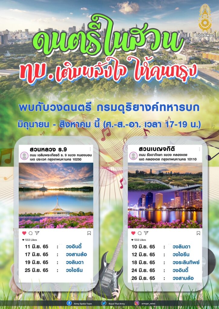 กรุงเทพ 10 มิ.ย. – ทบ. จัดดนตรีในสวน เติมพลังใจให้คน กทม. ช่วงสุดสัปดาห์ตลอด มิ.ย.-ส.ค.นี้ ที่สวนหลวง ร.9 และสวนป่าเบญจกิติ