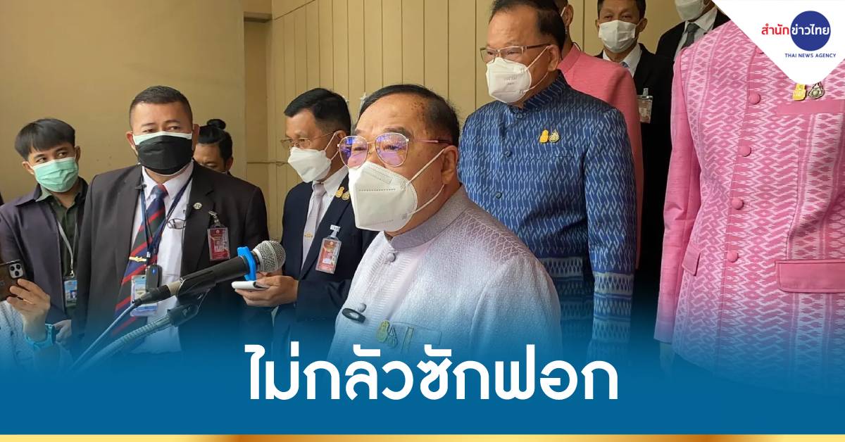 “ถ้าฝ่ายค้านอภิปรายเรื่องไม่จริง ผมก็จะพูดว่าเรื่องไม่จริง แต่ถ้าพูดเรื่องจริงผมก็พร้อมตอบ ไม่กังวลเสียงที่จะโหวตให้ ไม่ต้องเก็งข้อสอบ เพราะไม่ได้ทำอะไรผิด แล้วจะโดนอะไร ผมไม่กลัว เพราะไม่ได้ทำอะไรเลย ทำตามหน้าที่ทุกเรื่อง” พล.อ.ประวิตร กล่าว