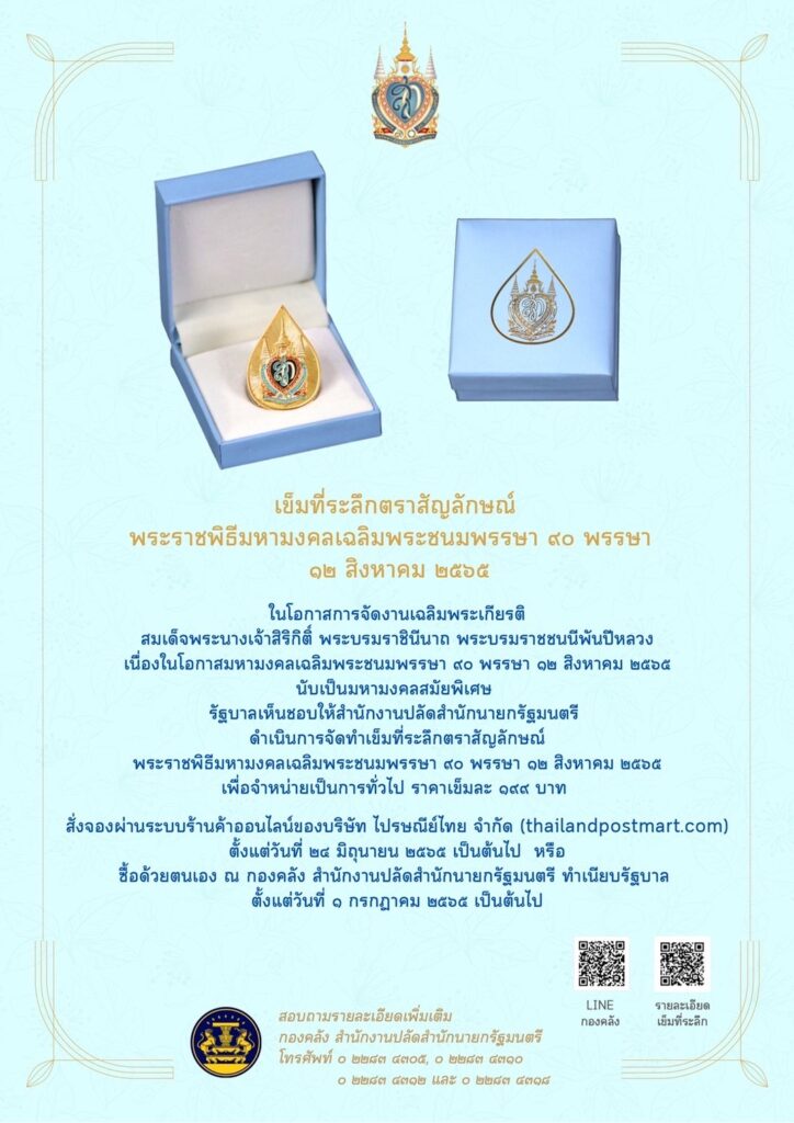 ทำเนียบรัฐบาล 24 มิ.ย.-สำนักงานปลัดสำนักนายกฯ เปิดรับการสั่งจองและจำหน่ายเข็มที่ระลึกตราสัญลักษณ์พระราชพิธีมหามงคลเฉลิมพระชนมพรรษา สมเด็จพระพันปีหลวง 90 พรรษา 12 สิงหาคม 2565
