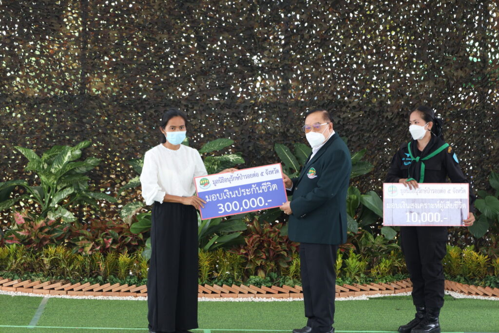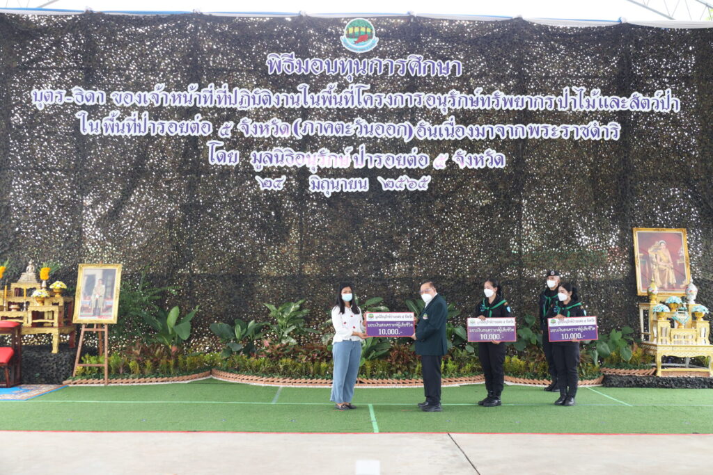 โดยในปี 2565 คณะกรรมการมูลนิธิฯ มีมติเห็นชอบให้มูลนิธิฯ สนับสนุนทุนการศึกษาระดับชั้นประถมศึกษาระดับชั้นมัธยมศึกษาและระดับอุดมศึกษาให้กับบุตร – ธิดา เจ้าหน้าที่ผู้ปฏิบัติงานในพื้นที่ป่ารอยต่อ 5 จังหวัด โดยมีผู้ขอรับทุนการศึกษา จำนวน 382 ทุน แบ่งออกเป็น ระดับประถมศึกษา จำนวน 123 ทุนๆ ละ 3,000 บาท ระดับมัธยมศึกษาและปวช. จำนวน 247 ทุน ทุนละ 5,000 บาท และระดับอุดมศึกษาและ ปวส. จำนวน 12 ทุน ทุนละ 10,000 บาท และนอกจากนี้ยังได้มอบเงินสินไหมทดแทนให้กับเจ้าหน้าที่ผู้เสียชีวิต 1 ราย มอบเงินสงเคราะห์ช่วยเหลือให้ราษฎรที่ถูกช้างป่าทำร้ายโดยมีผู้ได้รับบาดเจ็บ 1 ราย เสียชีวิต 3 ราย และมอบถังน้ำ จำนวน 200 ใบ ให้กับหน่วยที่ปฏิบัติงานอยู่ในพื้นที่ป่ารอยต่อ 5 จังหวัด เพื่อนำไปแจกจ่ายให้ วัด, โรงเรียน ,ชุมชนและหมู่บ้าน อทิ กองบัญชาการป้องกันชายแดนจันทบุรีและตราด กองกำลังบูรพา สำนักงานพัฒนาภาค 1 หน่วยบัญชาการทหารพัฒนา และสำนักจัดการทรัพยากรป่าไม้ที่ 9 สาขาปราจีนบุรี