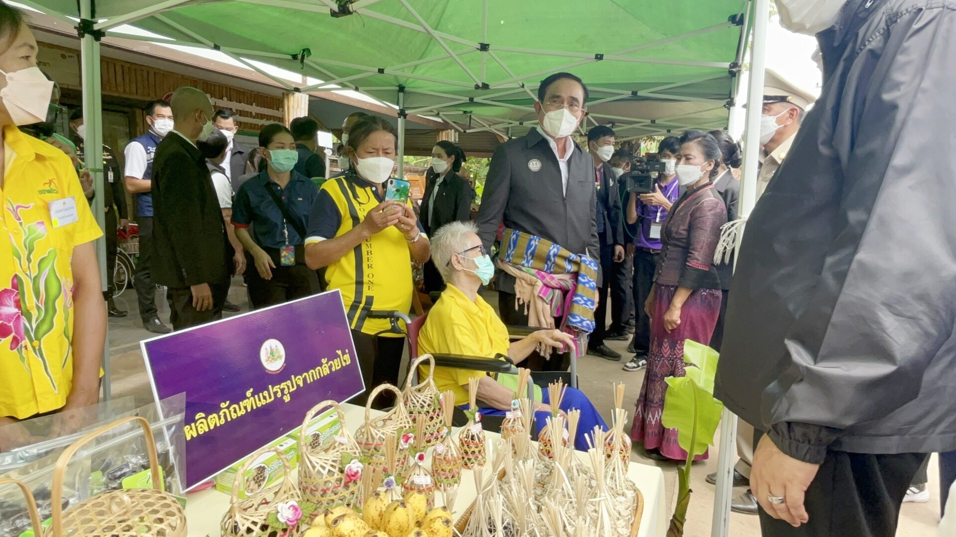 นายกรัฐมนตรีเยี่ยมชมการแปรรูปผลิตภัณฑ์จากกล้วยไข่ อาทิ แป้งกล้วยไข่ ข้าวเกรียบ น้ำพริกกล้วยไข่ เส้นหมี่ และแผ่นเกี๊ยวจากแป้งกล้วยไข่ ก่อนที่นายกรัฐมนตรีจะรับมอบกระเป๋าผ้าที่เขียนว่า ”กำแพงเพชร” โดยชาวบ้านบอกว่า “ขอให้ปกป้องคุ้มครองนายกฯ” ซึ่งนายกรัฐมนตรี กล่าวว่า กำแพงต้องปกป้องคุ้มครอง กำแพงต้องแข็งแรง ไม่ผุพัง ต้องเสริมไปเรื่อย ๆ ปกป้องคุ้มครองประเทศชาติประชาชนคนไทยทุกคน นั่นคือเจตนารมณ์ของพวกเรา
