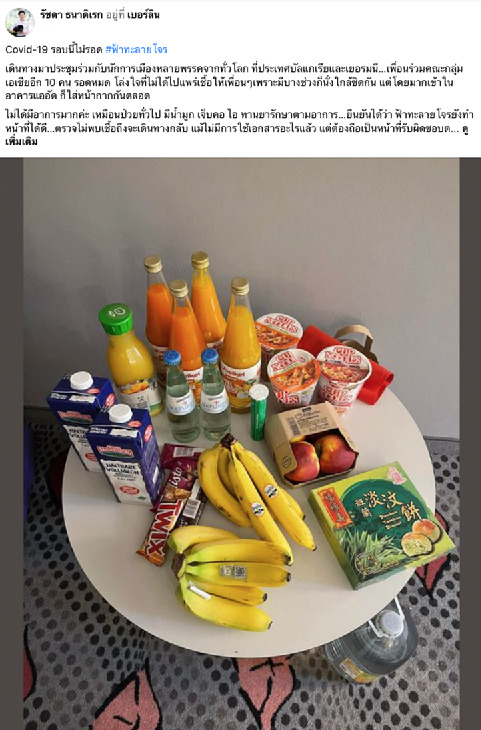 นางสาวรัชดา ระบุว่า ไม่ได้มีอาการมาก เหมือนป่วยทั่วไป มีน้ำมูก เจ็บคอ ไอ กินยารักษาตามอาการ ยืนยันได้ว่า ฟ้าทะลายโจรยังทำหน้าที่ได้ดี ตรวจไม่พบเชื้อถึงจะเดินทางกลับ แม้ไม่มีการใช้เอกสารอะไรแล้ว แต่ต้องถือเป็นหน้าที่รับผิดชอบต่อสังคม หากยังป่วยอยู่ต้องไม่เดินทาง ส่วนของกินเพื่อนร่วมคณะซื้อมาให้ คาดว่ามากเกินพอ เป้าหมายจะต้องกินกล้วยให้หมด อยู่เบอร์ลินทางสถานทูตได้ส่งยามาให้เพิ่มเติม คนไทยไปต่างประเทศ ควรมีเบอร์ติดต่อทางสถานทูตไว้ด้วย .-สำนักข่าวไทย