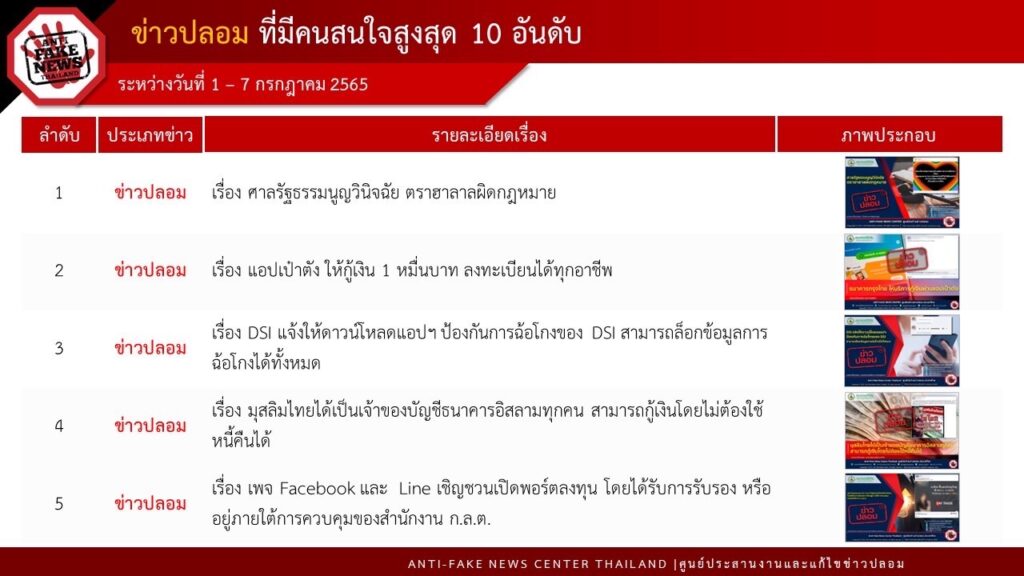 ดีอีเอส 9 ก.ค. – ดีอีเอส จับตาสถานการณ์ข่าวปลอมสัปดาห์แรก ก.ค.65 เฟคนิวส์บิดเบือนนโยบายรัฐ ข่าวสารราชการ ความสงบเรียบร้อยของสังคม พุ่งเฉียด 80% ของจำนวนเรื่องที่ต้องตรวจสอบ ครองทั้ง 10 อันดับข่าวปลอมคนสนใจสูงสุด