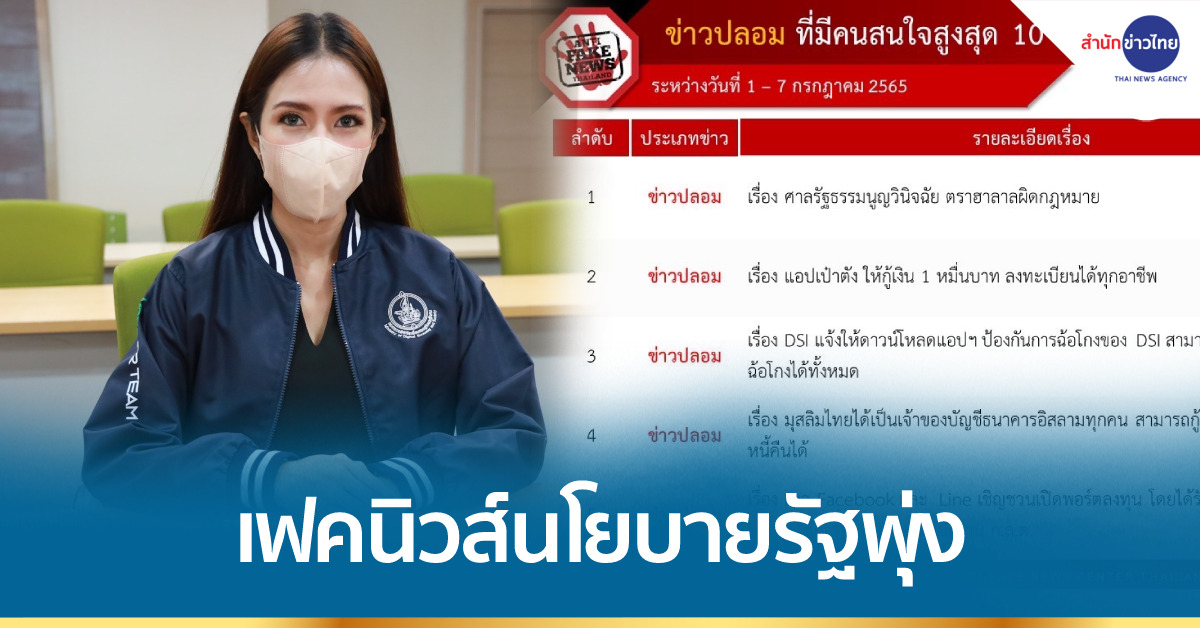 ขณะที่ เมื่อตรวจสอบข้อมูลเชิงลึก (Insight) พบว่าข่าวปลอมที่คนสนใจสูงสุด 10 อันดับในสัปดาห์ล่าสุดนี้ กระจุกตัวอยู่ที่ข่าวในกลุ่มที่ 1 คือ กลุ่มข่าวนโยบายรัฐฯ ทั้ง 10 ข่าว ตามลำดับดังนี้