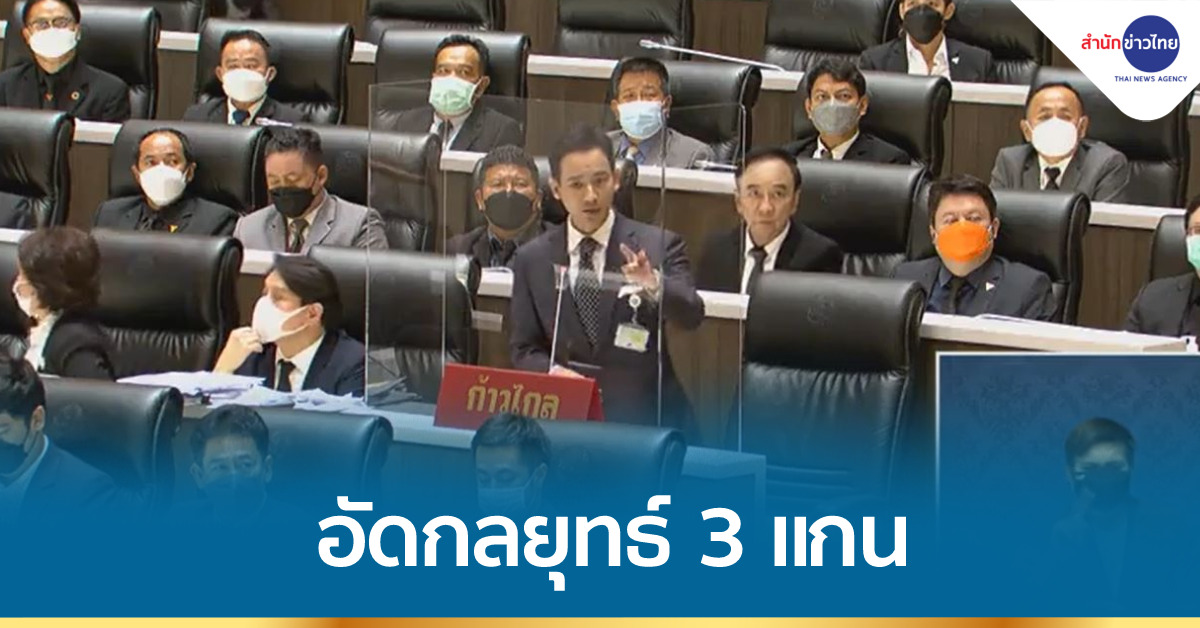 นายพิธา ลิ้มเจริญรัตน์ ส.ส.พรรคก้าวไกล อภิปรายไม่ไว้วางใจ พลเอกประยุทธ์ จันทร์โอชา นายกรัฐมนตรี กล่าวหาบริหารประเทศบกพร่อง สร้างความเสียหายทุกด้าน เพิ่กเฉยปล่อยปละละเลยให้มีการทุจริต เอื้อประโยชน์ให้ตนเองและพวกพ้อง เป็นต้นตอให้ปัญหาที่มีอยู่ซับซ้อนขยายวงกว้าง ทำคนไทยมืด 8 ด้าน ไม่มีความหวัง ไม่มีความฝัน ไม่มีอนาคต ส่วนกลยุทธ์ 3 แกนสร้างอนาคต เมื่อไปดูในรายละเอียดก็พบว่า เป็น 3 กลวง เพราะไม่ว่าจะเป็นคนที่รวยที่สุดหรือคนที่จนที่สุดในประเทศไทย ก็ไม่มีใครรู้เรื่องว่านายกต้องการสื่ออะไร เป็นของปลอมที่มีแต่เพียงเปลือก อย่างแกนที่ 1.โครงสร้างพื้นฐานก็ช้าและมีแต่จะเจ๊ง แกนที่ 2.อุตสาหกรรมยานยนต์ไฟฟ้าก็เริ่มต้นช้าตามหลังประเทศเพื่อนบ้าน ความหวังเป็นศูนย์กลางแทบไม่มีทางเป็นไปได้ และ แกนที่ 3.การเงินการธนาคารที่จะให้คน 30 ล้านเข้าถึงขนาดมีอำนาจเต็มยังทำไม่ได้ อีกทั้งแผนการเงินที่พูดมาก็เป็นสิ่งที่ตัวเองไม่รู้เรื่องไม่เข้าใจ และผู้บริหารธนาคารระดับประเทศเองก็บอกว่างงเป็นไก่ตาแตกกับแผนนี้