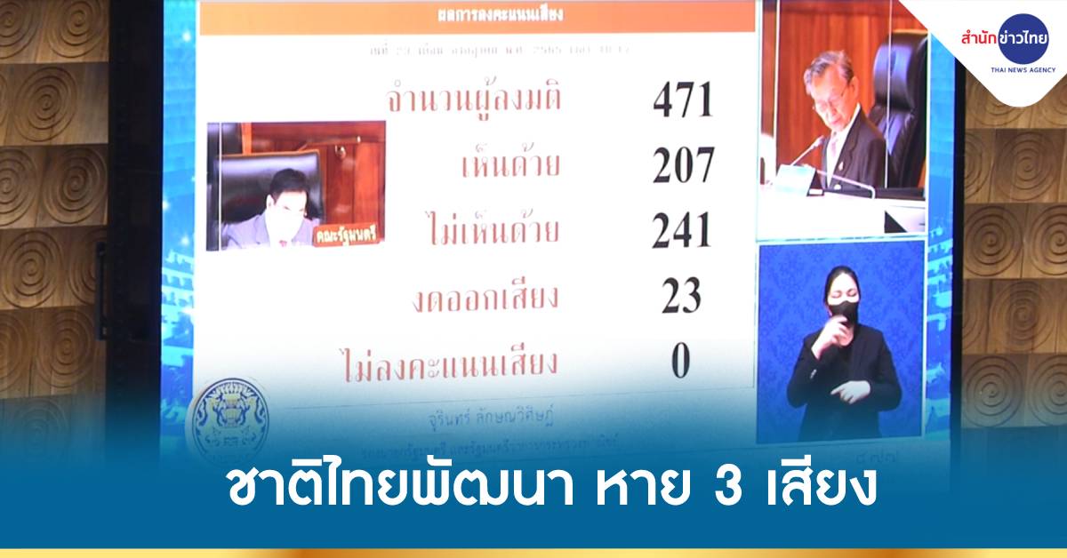 กทม. 23 ก.ค.-ส.ส. พรรคชาติไทยพัฒนา ถึง 3 คน งดออกเสียงให้ “จุรินทร์” รองนายกรัฐมนตรีและ รมว.พาณิชย์ ส่วนคะแนนจากประชาธิปัตย์ หายไป 1 เสียง