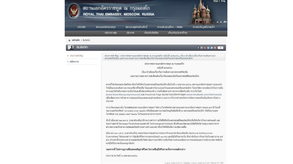 ผู้สื่อข่าวรายงานว่า เว็บไซต์สถานเอกอัครราชทูต ณ กรุงมอสโก ได้ออกประกาศสถานเอกอัครราชทูต ณ กรุงมอสโกประกาศ ฉบับที่ 7/2560 ณ วันที่ 4 เมษายน 2560 เรื่อง คำเตือนเกี่ยวกับการเดินทางมาประเทศรัสเซีย และรายงานสถานการณ์เพิ่มเติม เกี่ยวกับเหตุระเบิดใน นครเซนต์ปีเตอร์สเบิร์ก ว่า ตามที่ได้เกิดเหตุระเบิดที่สถานีรถไฟใต้ดินในนครเซนต์ปีเตอร์สเบิร์ก เมื่อวันที่ 3 เมษายน 2560 สถานเอกอัครราชทูตฯ ขอแนะนำให้ผู้มีแผนจะเดินทางมาท่องเที่ยวที่รัสเซีย โดยเฉพาะในกรุงมอสโกและนครเซนต์ปีเตอร์สเบิร์ก โปรดใช้ความระมัดระวังในการเดินทาง และใส่ใจสังเกตความเป็นไปและสิ่งผิดปกติรอบข้าง รวมทั้ง ติดตามข่าวสารจากสื่อท้องถิ่น จากเว็บไซต์ (www.thaiembassy.org/moscow) และ Facebook Page ของสถานเอกอัครราชทูตฯ (www.facebook.com/rtemoscow) เพื่อเพิ่มมาตรการรักษาความปลอดภัยของตนและผู้ร่วมเดินทาง นอกจากนี้ ควรทำประกันการเดินทางทุกครั้ง เมื่อเดินทางไปต่างประเทศ