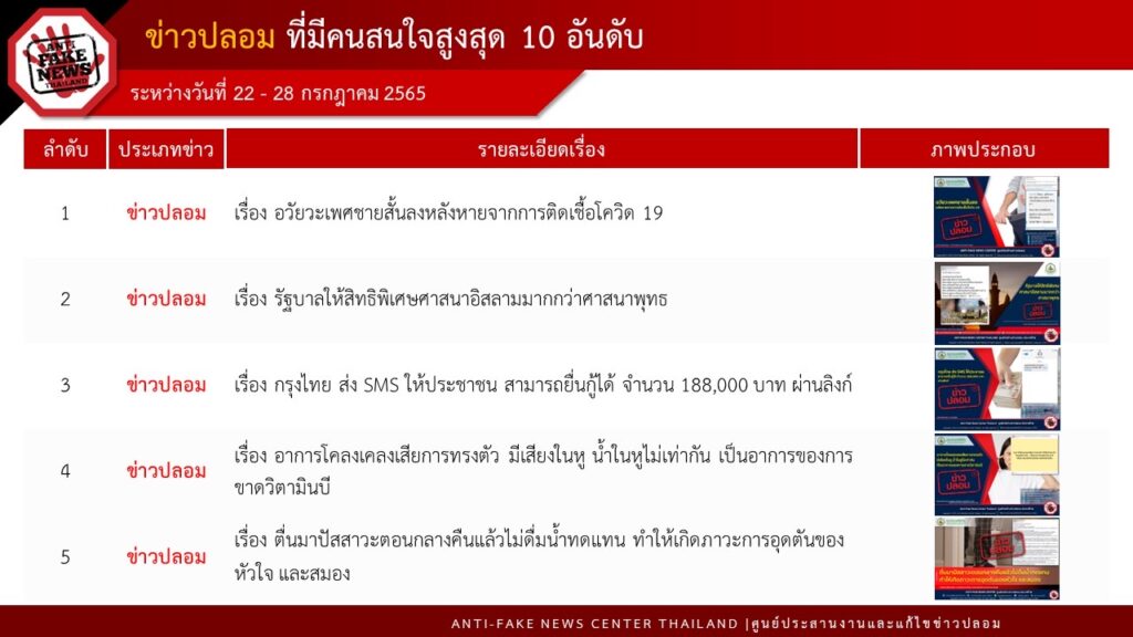 โดยรอบสัปดาห์ล่าสุด มีข่าวปลอมที่ได้รับความสนใจสูงสุด 10 อันดับแรก ดังนี้ อันดับ 1 อวัยวะเพศชายสั้นลงหลังหายจากการติดเชื้อโควิด 19 อันดับ 2 รัฐบาลให้สิทธิพิเศษศาสนาอิสลามมากกว่าศาสนาพุทธ อันดับ 3 กรุงไทย ส่ง SMS ให้ประชาชน สามารถยื่นกู้ได้ จำนวน 188,000 บาท ผ่านลิงก์ อันดับ 4 อาการโคลงเคลงเสียการทรงตัว มีเสียงในหู น้ำในหูไม่เท่ากัน เป็นอาการของการขาดวิตามินบี อันดับ 5 ตื่นมาปัสสาวะตอนกลางคืนแล้วไม่ดื่มน้ำทดแทน ทำให้เกิดภาวะการอุดตันของหัวใจ และสมอง