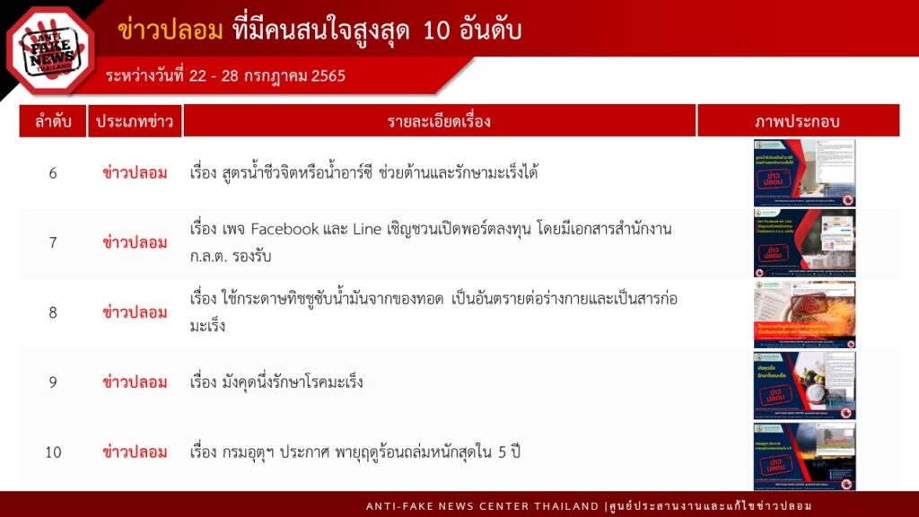 อันดับ 6 สูตรน้ำชีวจิตหรือน้ำอาร์ซี ช่วยต้านและรักษามะเร็งได้ อันดับ 7 เรื่อง เพจ Facebook และ Line เชิญชวนเปิดพอร์ตลงทุน โดยมีเอกสารสำนักงาน ก.ล.ต. รองรับ อันดับ 8 ใช้กระดาษทิชชูซับน้ำมันจากของทอด เป็นอันตรายต่อร่างกายและเป็นสารก่อมะเร็ง อันดับ 9 มังคุดนึ่งรักษาโรคมะเร็ง และอันดับ 10 กรมอุตุฯ ประกาศ พายุฤดูร้อนถล่มหนักสุดใน 5 ปี