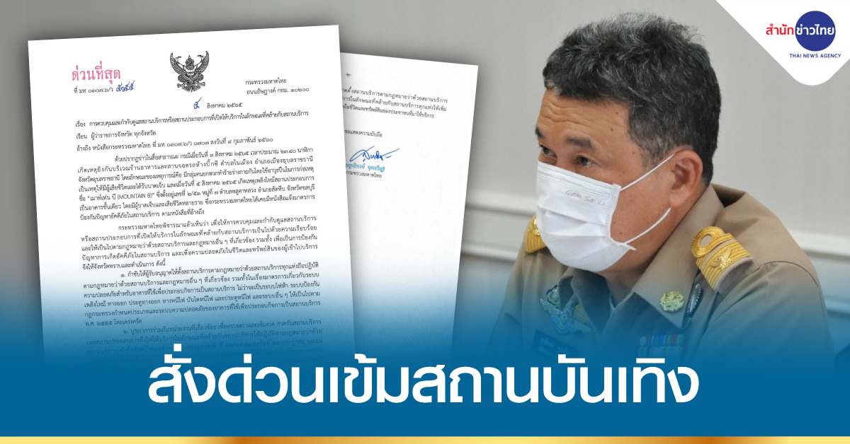 กรุงเทพฯ 6 ส.ค. – ปลัดมหาดไทย สั่งด่วนผู้ว่าฯ ทั่วประเทศ ดูแลความปลอดภัยสถานบันเทิงเคร่งครัด ขู่คาดโทษ หากพบเจ้าหน้าที่เพิกเฉย ไม่ควบคุมให้เป็นไปตามกฎหมาย เจอโทษทั้งอาญาและปกครองอย่างเฉียบขาด