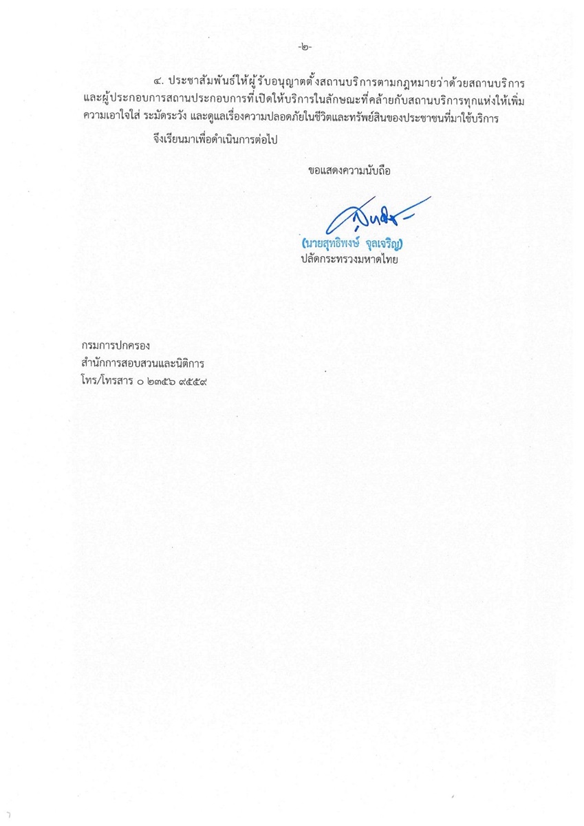 ทั้งนี้ หากพบว่าสถานบริการและสถานประกอบการใดกระทำการที่ฝ่าฝืนกฎหมาย ให้พนักงานเจ้าหน้าที่ดำเนินการตามอำนาจหน้าที่อย่างเข้มงวด ทั้งทางอาญาและทางปกครอง และในกรณีที่ปรากฏว่ามีการเพิกเฉยหรือละเลยไม่กระทำการหรืองดเว้นกระทำการตามกฎหมายของเจ้าหน้าที่ ให้ผู้บังคับบัญชาของเจ้าหน้าที่ผู้นั้น ดำเนินการทั้งทางอาญาและทางปกครองอย่างเฉียบขาดและรวดเร็ว และให้รายงานผลการดำเนินการในเรื่องดังกล่าวให้กระทรวงมหาดไทยทราบด้วย” นายสุทธิพงษ์ กล่าวเน้นย้ำ