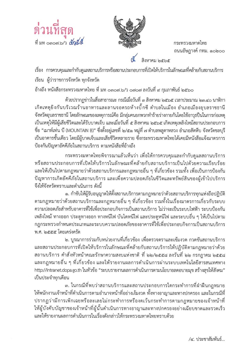 นายสุทธิพงษ์ จุลเจริญ ปลัดกระทรวงมหาดไทย เปิดเผยว่า ตามที่ได้เกิดเหตุกลุ่มคนยกพวกทำร้ายร่างกายกัน โดยใช้อาวุธปืนก่อเหตุ บริเวณร้านอาหารและลานจอดรถห้างบิ๊กชี ตำบลในเมือง อำเภอเมืองอุบลราชธานี จังหวัดอุบลราชธานี ทำให้มีผู้เสียชีวิตและได้รับบาดเจ็บ เมื่อวันที่ 3 ส.ค.65 และเกิดเหตุเพลิงไหม้สถานประกอบการ ชื่อ “เมาท์เท่น บี (MOUNTAIN B)” ตำบลพลูตาหลวง อำเภอสัตหีบ จังหวัดชลบุรี เมื่อวันที่ 5 ส.ค.65 จนทำให้มีผู้บาดเจ็บและเสียชีวิตหลายราย พล.อ.อนุพงษ์ เผ่าจินดา รัฐมนตรีว่าการกระทรวงมหาดไทย ให้ความสำคัญ และเน้นย้ำในการประชุมมอบนโยบายและข้อสั่งการของกระทรวงมหาดไทยให้กับผู้ว่าราชการจังหวัดและนายอำเภอ ในการดำเนินการตามนโยบาย “ลดอบายมุข สร้างสุขให้สังคม” มาอย่างต่อเนื่อง พร้อมทั้งกำชับให้เข้มงวดกวดขัน ตรวจตราสถานบริการและสถานประกอบการที่มีลักษณะคล้ายสถานบริการ ให้ปฏิบัติตามกฎหมายที่เกี่ยวข้องอย่างเคร่งครัด เพื่อความปลอดภัยในชีวิตและทรัพย์สินของผู้ที่เข้าไปใช้บริการ ทั้งการตรวจสอบสถานบริการที่มีสภาพอาคารเสี่ยงต่อความปลอดภัยในชีวิตและทรัพย์สินของผู้เข้าไปใช้บริการ