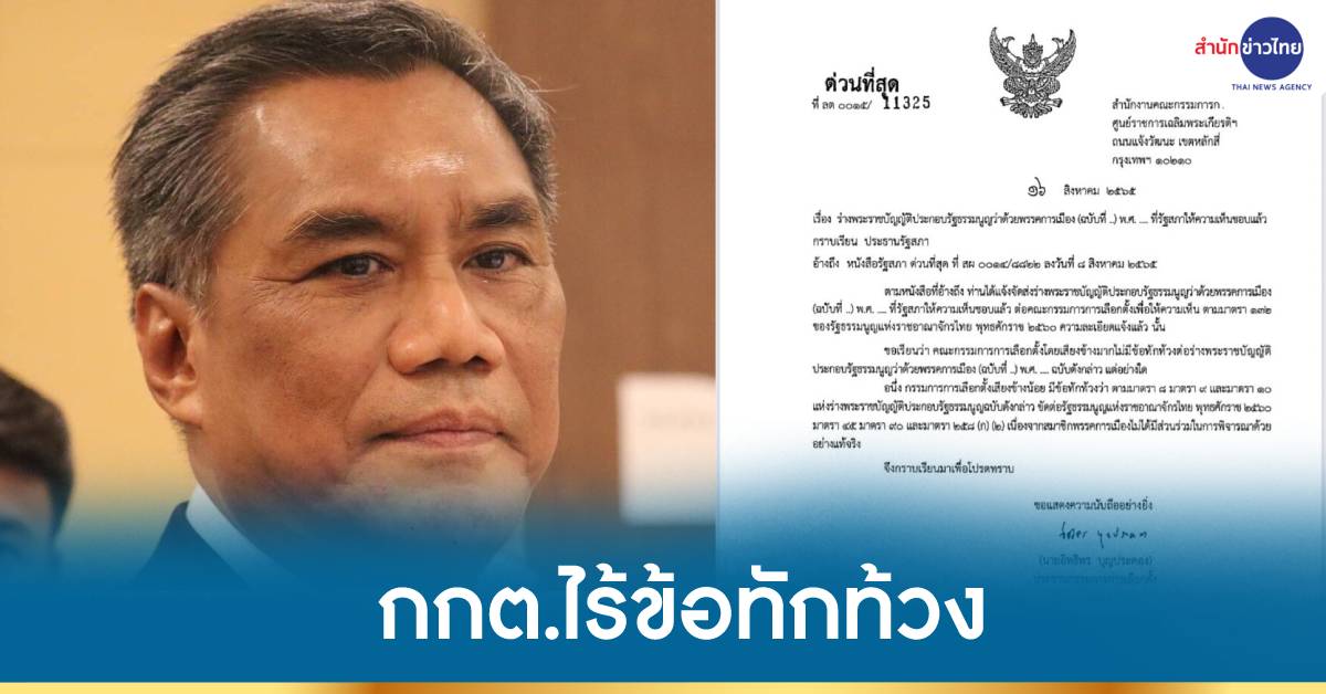 โดย กกต. แจ้งว่า กกต.เสียงข้างมากไม่มีข้อทักท้วงต่อร่างกฏหมายฉบับดังกล่าวแต่อย่างใด พร้อมให้ข้อสังเกตเพิ่มเติมว่า กกต. เสียงข้างน้อย มีข้อทักท้วงมาตรา 8 มาตรา 9 และมาตรา 10 ขัดต่อรัฐธรรมนูญแห่งราชอาณาจักรไทย เนื่องจากสมาชิกพรรคการเมืองไม่ได้มีส่วนร่วมในการพิจารณาด้วยอย่างแท้จริง .- สำนักข่าวไทย