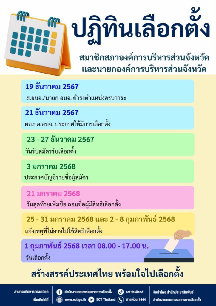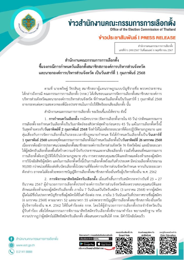 สำนักงานคณะกรรมการการเลือกตั้ง ออกเอกสารชี้แจงกรณีการกำหนดวันเลือกตั้งสมาชิกสภาองค์การบริหารส่วนจังหวัดและนายกองค์การบริหารส่วนจังหวัด ในวันเสาร์ที่ 1 กุมภาพันธ์ 2568 หลังนายพริษฐ์ วัชรสินธุ สส.พรรคประชาชน ติงหลังเห็นแผนการจัดการเลือกตั้ง อาจกระทบต่อความสะดวกของพี่น้องประชาชนในการไปใช้สิทธิออกเสียงเลือกตั้ง ว่า การกำหนดวันเลือกตั้งดังกล่าวอยู่ในระยะเวลาจัดการเลือกตั้งภายใน 45 วัน ปกติจะกำหนดวันเลือกตั้งเป็นวันอาทิตย์ของสัปดาห์สุดท้ายก่อนครบ 45 วัน แต่ครั้งนี้วันสุดท้ายตรงกับวันอาทิตย์ที่ 2 กุมภาพันธ์ 2568 จึงทำให้ไม่เหลือระยะเวลาที่ต้องปฏิบัติตามกฎหมาย และสุ่มเสี่ยงกับการจัดการเลือกตั้งเกินระยะเวลาที่กฎหมายกำหนด จึงได้กำหนดวันเลือกตั้งเป็นวันเสาร์ที่ 1 กุมภาพันธ์ 2568 และที่ไม่กำหนดวันเลือกตั้งเป็นวันอาทิตย์ที่ 26 มกราคม 2568 เนื่องจากต้องมีการประกาศแบ่งเขตเลือกตั้งสมาชิกสภา อบจ. 76 จังหวัดใหม่ และมีระยะเวลาให้ผู้สมัครรับเลือกตั้งลงพื้นที่สร้างความเข้าใจกับประชาชนและหาเสียงเลือกตั้ง รวมถึงขั้นตอนที่ กกต.ต้องตรวจสอบคุณสมบัติและลักษณะต้องห้ามของผู้สมัคร การวินิจฉัยสิทธิผู้สมัคร และในการเลือกตั้งครั้งนี้เป็นการเลือกตั้งพร้อมกันทั่วประเทศ มีหน่วยเลือกตั้งประมาณ 90,000 กว่าหน่วย