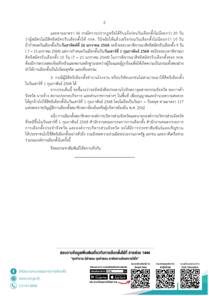 ทั้งนี้ กรณีผู้มีสิทธิเลือกตั้งทำงานโรงงาน หรือบริษัทเอกชนไม่สามารถมาใช้สิทธิเลือกตั้ง ในวันเสาร์ที่ 1 กุมภาพันธ์ 2568 ได้ กกต. ชี้แจงว่าจะมีหนังสือประสานไปยังสภาอุตสาหกรรมจังหวัด หอการค้าจังหวัด นายจ้าง สถานประกอบกิจการ และส่วนราชการต่างๆ ในพื้นที่ เพื่ออนุญาตและอำนวยความสะดวกให้ลูกจ้างไปใช้สิทธิเลือกตั้งในวันเสาร์ที่ 1 กุมภาพันธ์ 2568 โดยไม่ถือเป็นวันลา – วันหยุด ตามมาตรา 117 กฎหมายเลือกตั้งท้องถิ่น และสำนักงาน กกต. จะประชาสัมพันธ์ให้ประชาชนไปใช้สิทธิเลือกตั้งอย่างทั่วถึง. -314 สำนักข่าวไทย