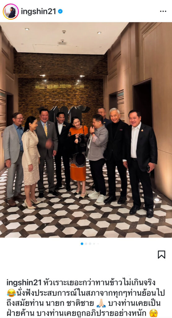 “หัวเราะเยอะกว่าทานข้าวไม่เกินจริง นั่งฟังประสบการณ์ในสภาจากทุกท่าน ย้อนไปถึงสมัยท่านนายกฯ ชาติชาย (พลเอก ชาติชาย ชุณหะวัณ) บางท่านเคยเป็นฝ่ายค้าน บางท่านเคยถูกอภิปรายอย่างหนัก รูปแบบห้องทานข้าว ตึกเดิม ยุคแพ็คลิงค์ ก็มา!! ขอบพระคุณประสบการณ์จากทุกท่านที่ได้แชร์กันตอนทานข้าวค่ะ สนุกสนาน มีกำลังใจ ได้คุยครบทุกคนเจอกันวันจันทร์นะคะ”