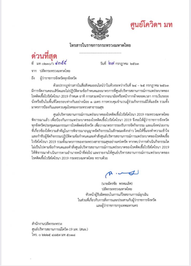 ศูนย์บริหารสถานการณ์แพร่ระบาดของโรคติดเชื้อไวรัสโคโรนา 2019 กระทรวงมหาดไทย (ศบค.มท.) เผยแพร่เอกสารที่ลงนามโดยนายฉัตรชัย พรหมเลิศ ปลัดกระทรวงมหาดไทย ในฐานะหัวหน้าผู้รับผิดชอบในการแก้ไขสถานการณ์ฉุกเฉินในส่วนที่เกี่ยวกับการสั่งการและประสานกับผู้ว่าราชการจังหวัดและผู้ว่าราชการกรุงเทพมหานคร เนื้อหาระบุว่า ด้วยปรากฏข่าวสารในสื่อสังคมออนไลน์ว่า ในช่วงระหว่างวันที่ 24-25 ก.ค. 63 มีการจัดงานคอนเสิร์ตและไม่ปฏิบัติตามข้อกำหนดและมาตรการที่ศูนย์บริหารสถานการณ์การแพร่ระบาดของโรคติดเชื้อไวรัสโคโรนา 2019 (ศบค.) กำหนด อาทิ การสวมหน้ากากอนามัยหรือหน้ากากผ้าตลอดเวลา การเว้นระยะนั่งหรือยืนในพื้นที่โดยรอบห่างกันอย่างน้อย 1 เมตร การควบคุมจำนวนผู้ร่วมกิจกรรมมิให้แออัด รวมทั้งมาตรการป้องกันและควบคุมโรคของกระทรวงสาธารณสุข