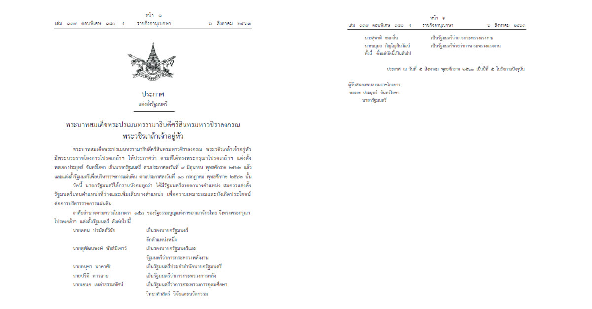 กรุงเทพฯ 6 ส.ค.- พระบาทสมเด็จพระเจ้าอยู่หัวทรงมีพระบรมราชโองการโปรดเกล้าฯ รัฐมนตรีใหม่ แทนตำแหน่งที่ว่างแล้ว