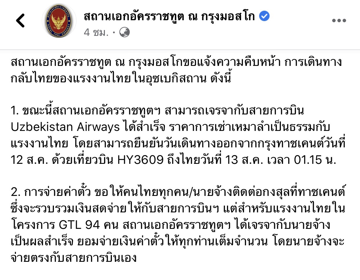 สถานเอกอัครราชทูต ณ กรุงมอสโก โพสต์ข้อความผ่านทางเฟซบุ๊ก ระบุว่า ขอแจ้งความคืบหน้า การเดินทางกลับไทยของแรงงานไทยในอุซเบกิสถาน ดังนี้