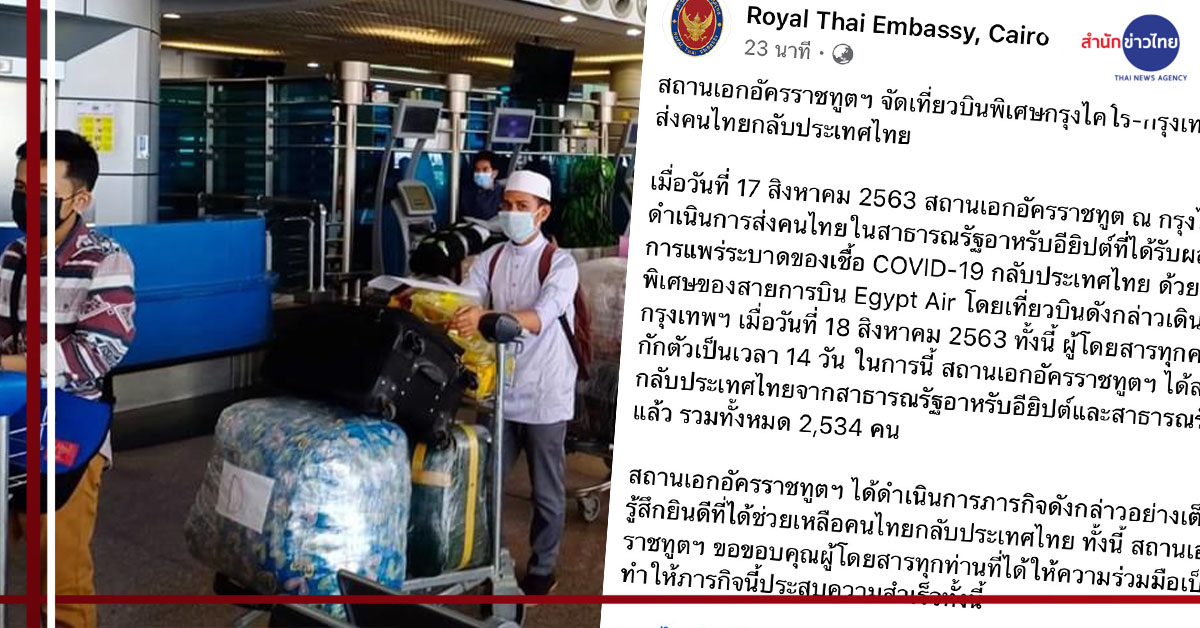 สถานเอกอัครราชทูต ณ กรุงไคโร โพสต์ข้อความผ่านทางเฟซบุ๊ก ระบุว่าเมื่อวันที่ 17 สิงหาคม 2563 สถานเอกอัครราชทูต ณ กรุงไคโร ได้ดำเนินการส่งคนไทยในสาธารณรัฐอาหรับอียิปต์ที่ได้รับผลกระทบจากการแพร่ระบาดของเชื้อ COVID-19 กลับประเทศไทย ด้วยเที่ยวบินพิเศษของสายการบิน Egypt Air โดยเที่ยวบินดังกล่าวเดินทางถึงกรุงเทพฯ เมื่อวันที่ 18 สิงหาคม 2563 ทั้งนี้ ผู้โดยสารทุกคนจะถูกกักตัวเป็นเวลา 14 วัน ในการนี้ สถานเอกอัครราชทูตฯ ได้ส่งคนไทยกลับประเทศไทยจากสาธารณรัฐอาหรับอียิปต์และสาธารณรัฐซูดานแล้ว รวมทั้งหมด 2,534 คน