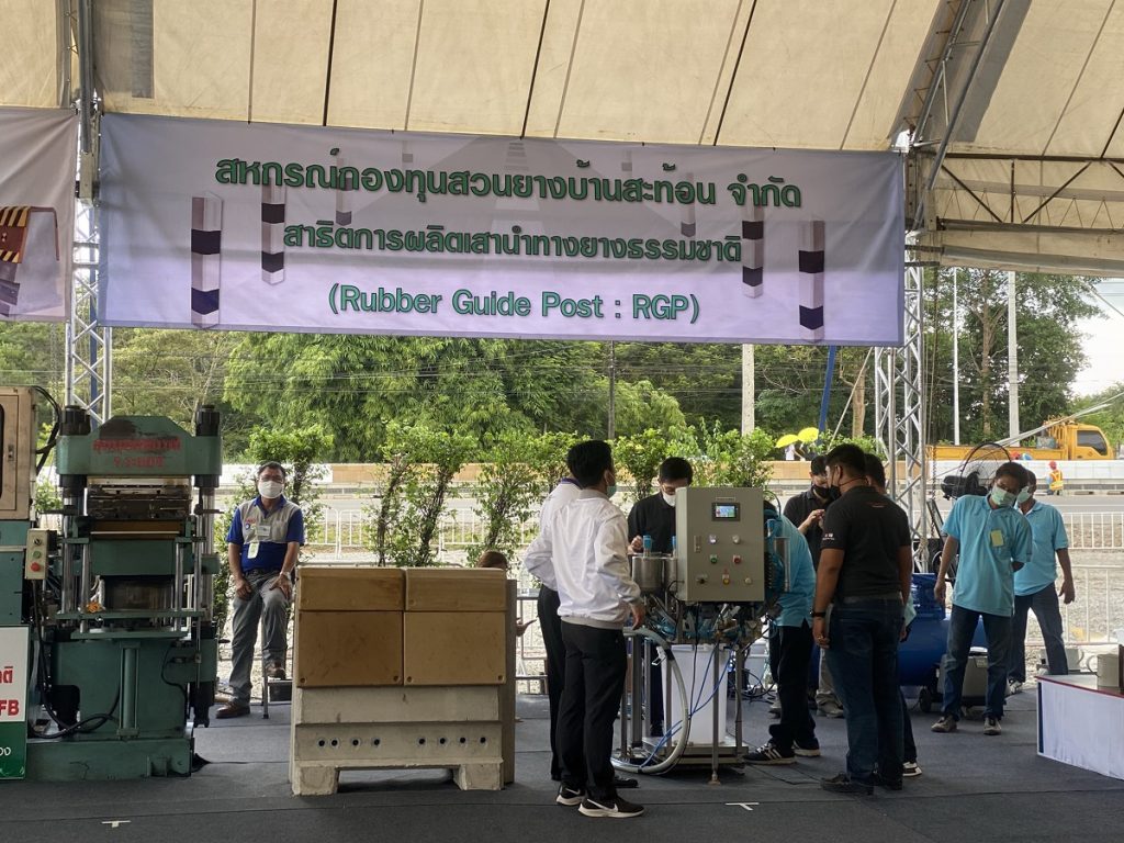 จากนั้น นายกรัฐมนตรี ได้ดูการสาธิตการผลิตแผ่นยางธรรมชาติครอบกำแพงคอนกรีต สำหรับการใช้กำแพงคอนกรีตหุ้มด้วยแผ่นยางธรรมชาติ และหลักนำทางยางธรรมชาติ ถือเป็นการปักหมุดโครงการนี้ ในประเทศไทย โดยในวันนี้จะมีนิทรรศการเสมือนจริงในการสาธิตขั้นตอนต่าง ๆ อย่างละเอียด ตั้งแต่การผสมยาง การขึ้นแบบ การอบ จนถึงการทาสีอุปกรณ์ทั้ง 2 ชนิด พร้อมรับชมการติดตั้งใช้งาน บนถนนจริง ด้วยเวลาอันรวดเร็ว โดย 3 ปีแรกของโครงการฯ จะมีการใช้ยางพาราจำนวนไม่น้อยกว่า 1 ล้านตัน เกษตรกรชาวสวนยางพาราจะมีรายได้ไม่ต่ำกว่า 3 หมื่นล้านบาท และในช่วงปีที่ 3 วัสดุยางพาราจะเสื่อมสภาพ หมดอายุการใช้งาน ในปีต่อไปต้องใช้ยางพารามาผลิตวัสดุยางพาราใหม่ หมุนเวียนไปทุก ๆ ปี ทำให้เกิดเสถียรภาพการใช้ยางพาราอย่างยั่งยืน